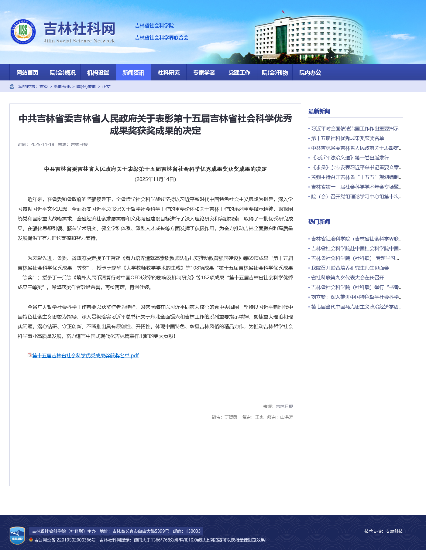 近日,中共吉林省委、吉林省人民政府发布《中共吉林省委吉林省人民政府关于表彰第十五届吉林省社会科学优秀成果奖获奖成果的决定》,麻豆