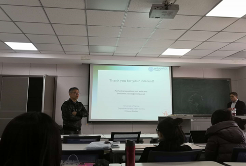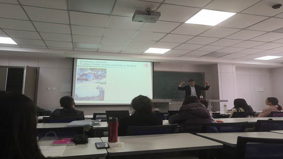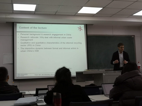 讲座伊始,李慧杰讲师简要介绍了Benjamin Steuer博士的学术经历、学术地位与学术贡献。Steuer博士围绕主题,从个人的学术背景及在中国的相关调研经历;调研方法:为什么要进行非正式生活垃圾治理;从定性和定量两方面对非正式的生活垃圾回收进行指标测量;中国非正式的生活垃圾处理和正式的生活垃圾处理之间的互动四个方面为在场师生带来了一场学术盛宴。