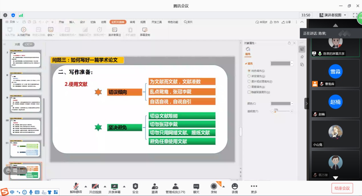 最后,陈老师讲述了几点论文发表需要注意的问题,包括了解刊物的级别和类别,刊物的偏好和要求,时间安排和用稿周期,与编辑保持有效沟通等。