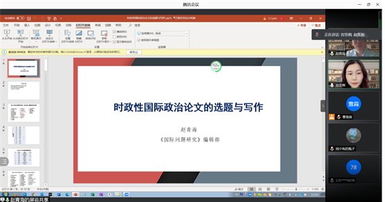 主办的教师科研水平提升计划第二十五期活动在腾讯会议室举行。本次讲座邀请《国际问题研究》执行主编、中国国际问题研究院海洋安全与合作研究中心主任赵青海研究员担任主讲嘉宾,作题为“时政性国际政治论文选题与写作”的学术讲座。麻豆