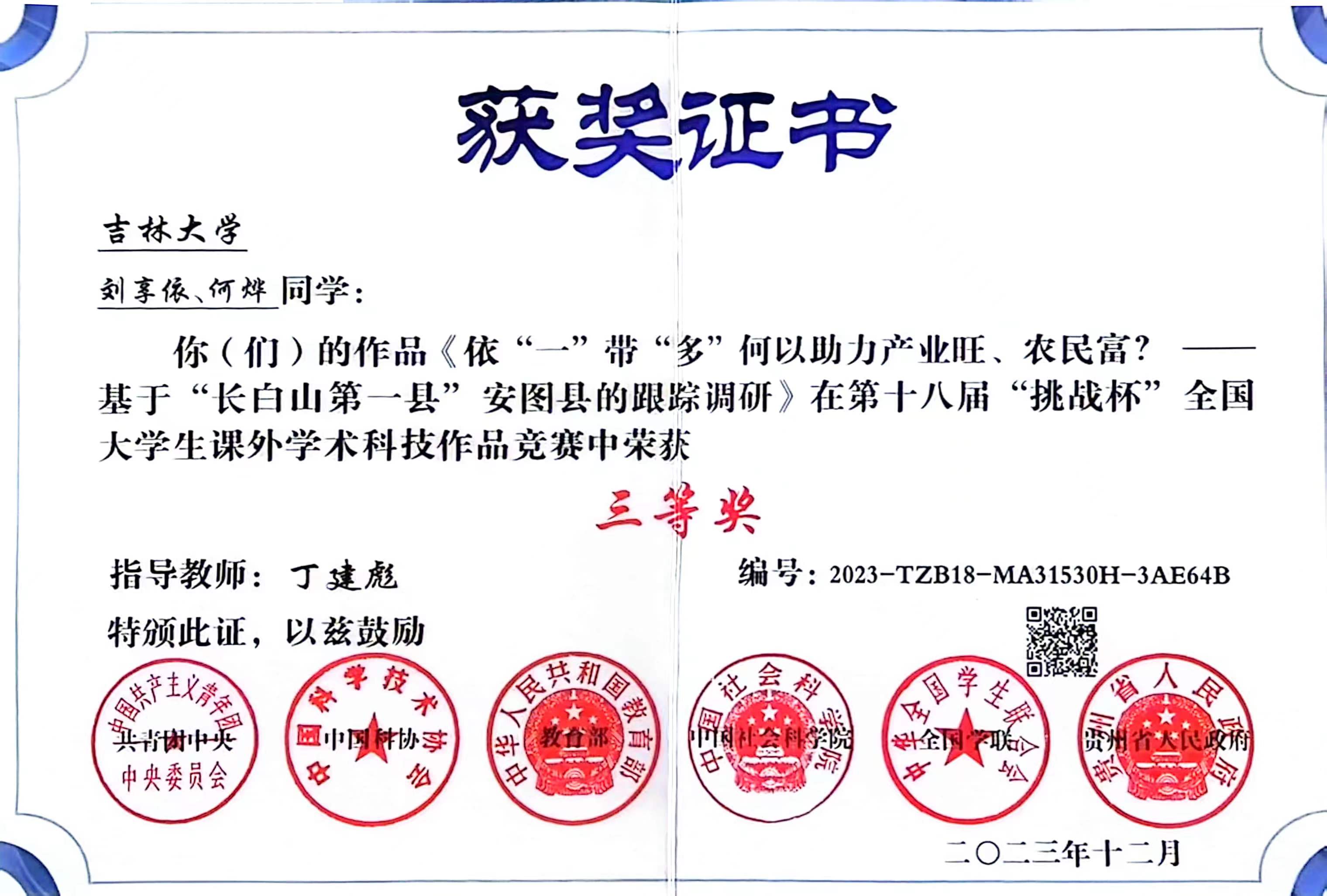 麻豆 丁建彪教授指导的《依“一”带“多”何以助力产业旺、农民富?——基于“长白山第一县”安图县的跟踪调查》在第十八届“挑战杯”全国大学生课外学术科级作品竞赛中荣获三等奖。