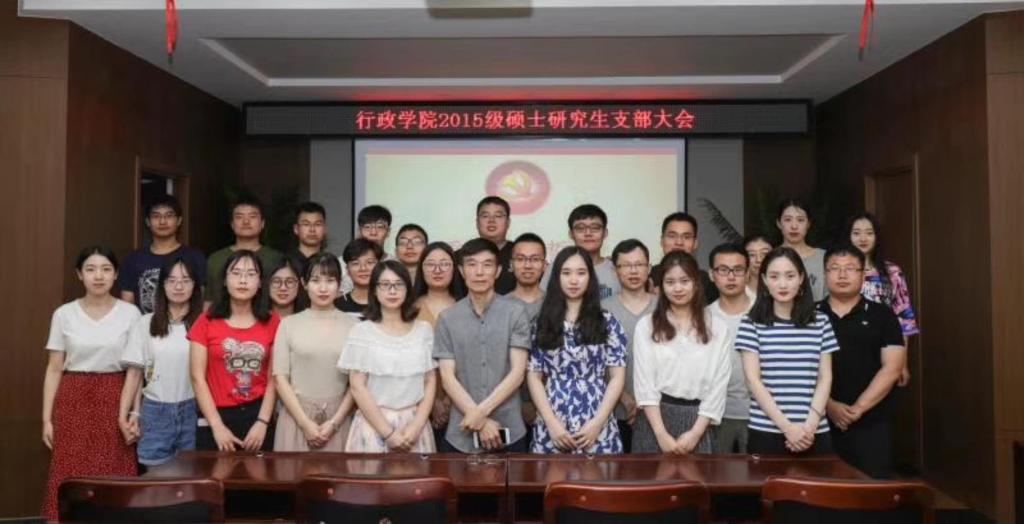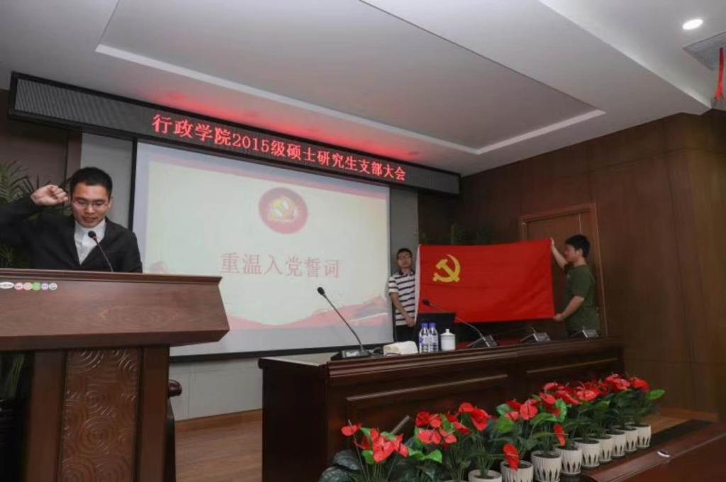 2015级硕士研究生党支部召开毕业支部大会。本次支部大会包括预备党员转正、重温入党誓词、毕业党课三个环节。参会人员为学院副书记常有余、全体支委会成员、全体需转正的预备党员、绝大多数正式党员和部分预备党员。会议由2015级硕士研究生党支部书记宋国新主持。