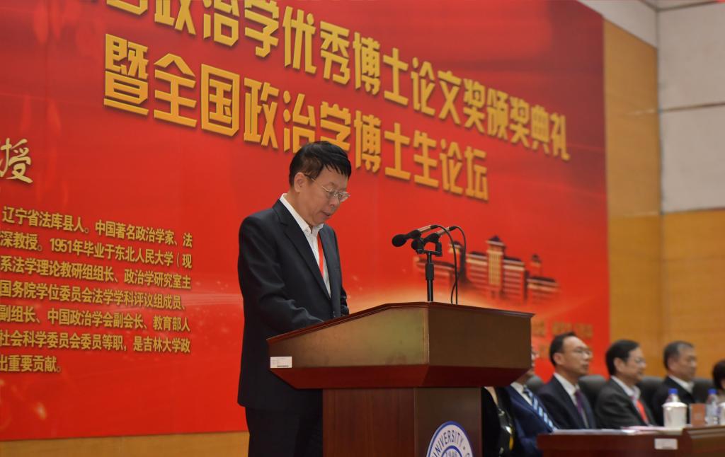 各项事业、特别是王惠岩政治学优秀博士论文奖以及全国政治学博士生论坛的大力支持表示衷心感谢。最后,张贤明院长宣读了学院杰出院友、王惠岩先生的弟子,原中共中央政治局委员、国务院副总理刘延东同志为此次颁奖典礼发来的信件,她由衷祝贺王惠岩政治学优秀博士论文奖颁奖典礼并向全院师生致以亲切问候。刘延东同志在信件中对王惠岩先生表达了缅怀,并勉励全院师生不忘初心,牢记使命,以习近平新时代中国特色社会主义思想为指导,为新时代中国政治学的繁荣和发展,在人才培养、科学研究、社会服务和文化传承创新上不断取得新成绩,为实现两个一百年奋斗目标和中华民族伟大复兴中国梦做出新的更大的贡献。