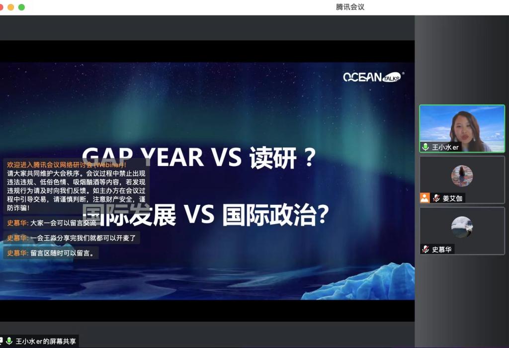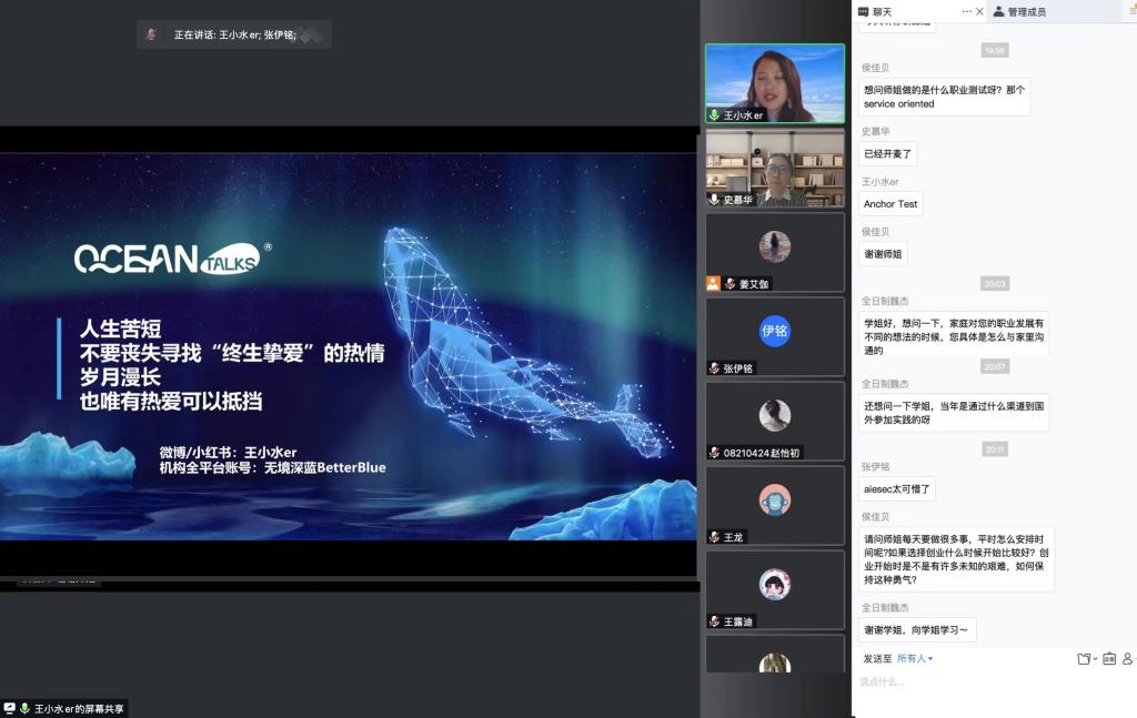 主办的“职业能力提升计划”系列活动在腾讯会议平台进行。本次活动邀请到学院2007级国际政治毕业生、无境深蓝发起人及理事长、2018年联合国地球青年卫士、联合国宪法研究中心气候变化青年大使——王淼做客腾讯会议室,为学生们作题为“不会做经纪人的潜水教练不是好公益人——政治学背景的职业成长道路”的讲座,活动由学院党委副书记史慕华主持。