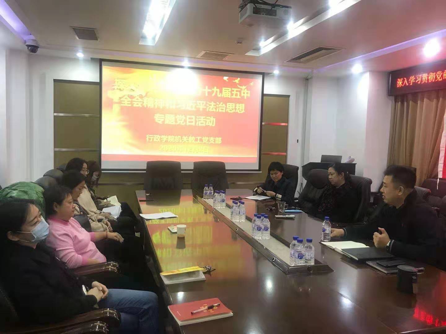 根据学校党委《关于认真学习宣传党的十九届五中全会精神的通知》要求和学院党委的相关工作部署,机关教工党支部于2020年12月2日,召开党员大会,开展“深入学习贯彻党的十九届五中全会精神和习近平法治思想”专题党日活动。会议由支部书记密佳音主持,全体支部党员参加会议。