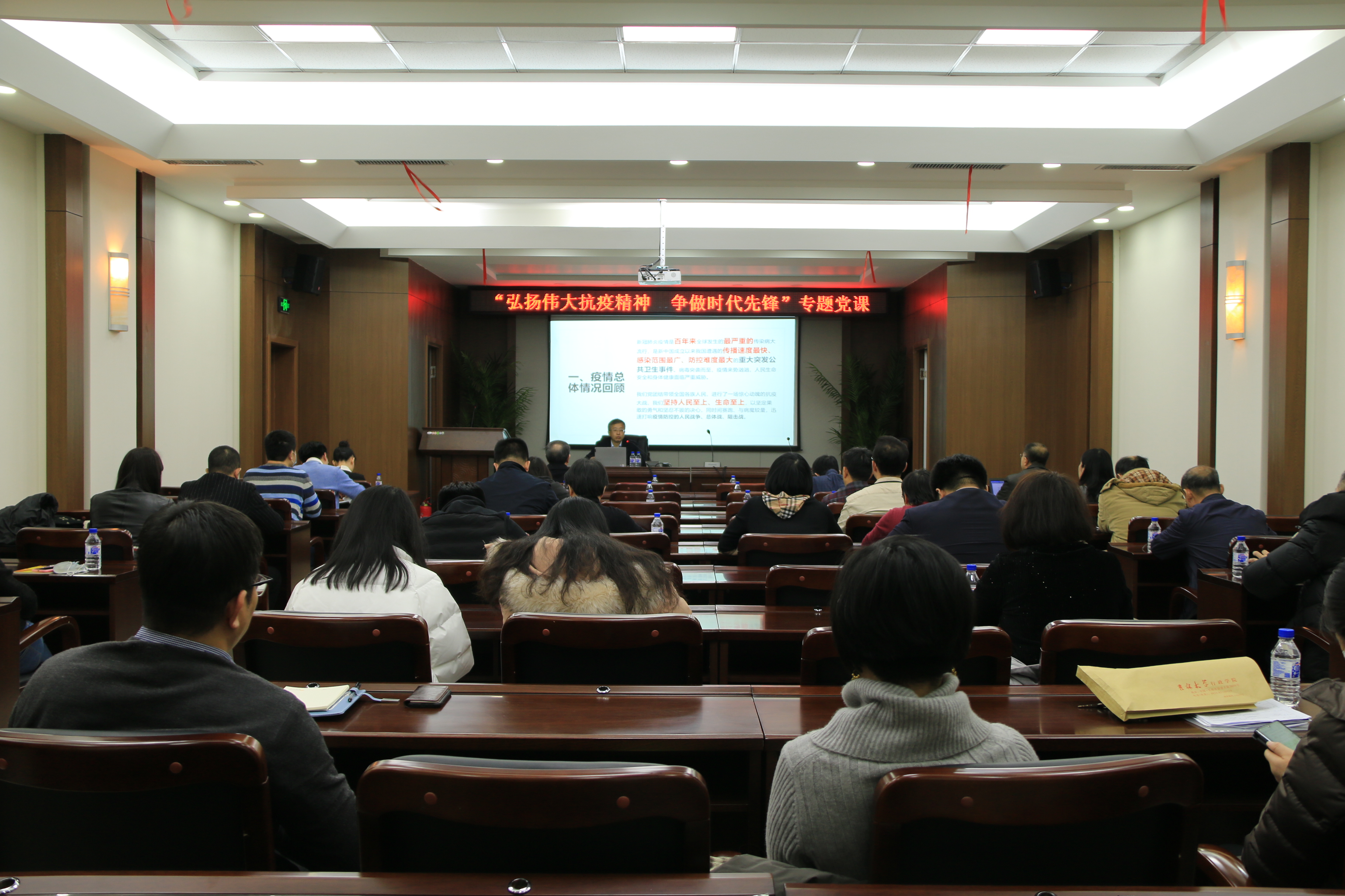 为弘扬伟大抗疫精神,激励各位党员同志争做时代先锋,2020年12月11日,政治学教工党支部在东荣大厦B303会议室举办了以“弘扬伟大抗疫精神 争做时代先锋”为主题的专题党课。支部特意邀请到吉林省支援武汉抗疫前线指挥部副总指挥、吉林省卫健委医政医管处张诚处长讲授党课。党课开始前,麻豆