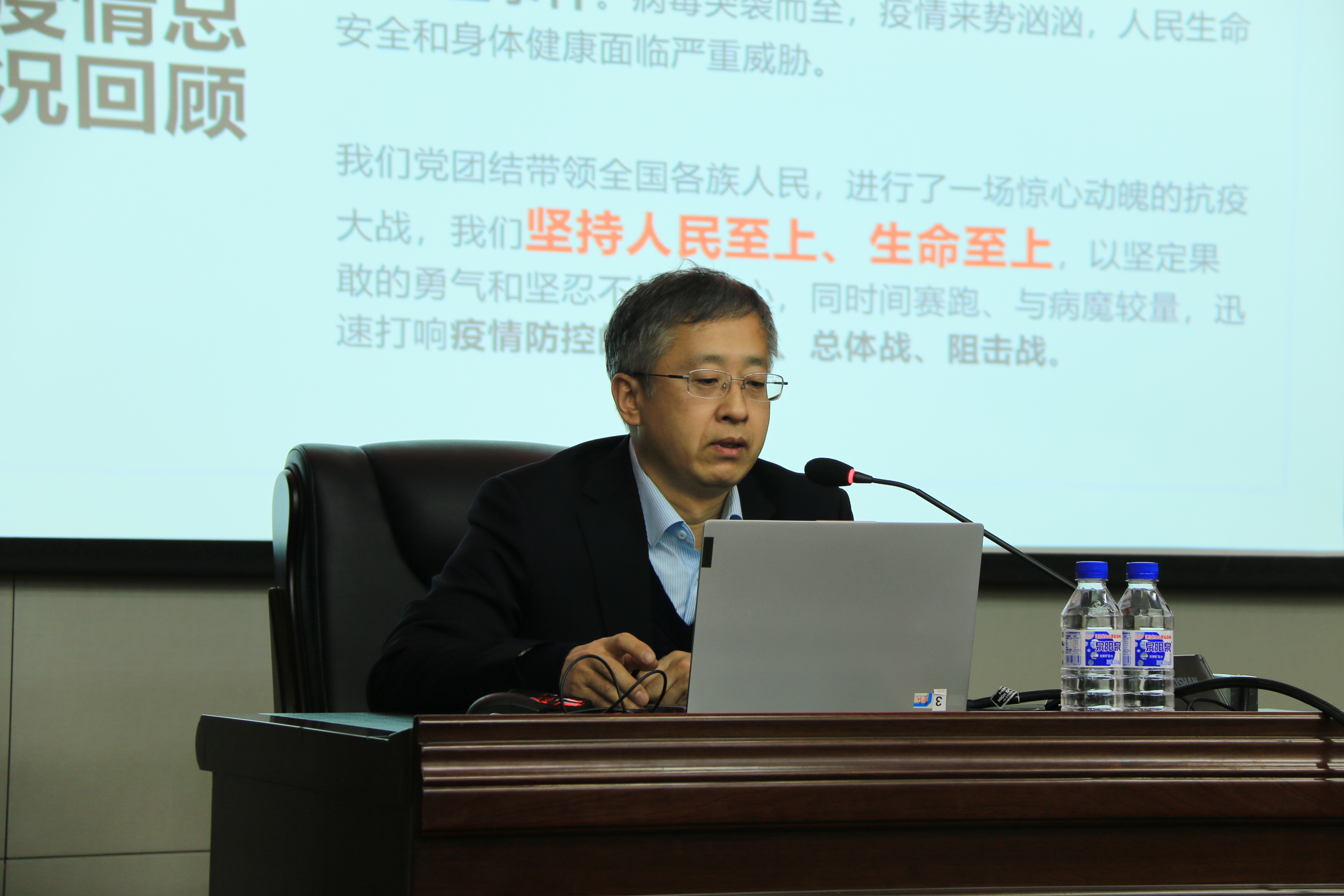 首先,张诚处长对本次疫情的总体情况、吉林省目前疫情情况、吉林省疫情防控概要、吉林省支援武汉抗疫工作情况、前指医疗队员管理情况、强化党的领导抓好前线党建工作等做了详细介绍,结合亲身经历讲述了和“战友”在武汉抗疫中的难忘经历,以及吉林省社会各界,特别是医疗和卫生健康系统工作人员在武汉抗疫中的责任与担当,还特别向疫情抗战中武汉及武汉人民的感恩之心表示由衷致敬。