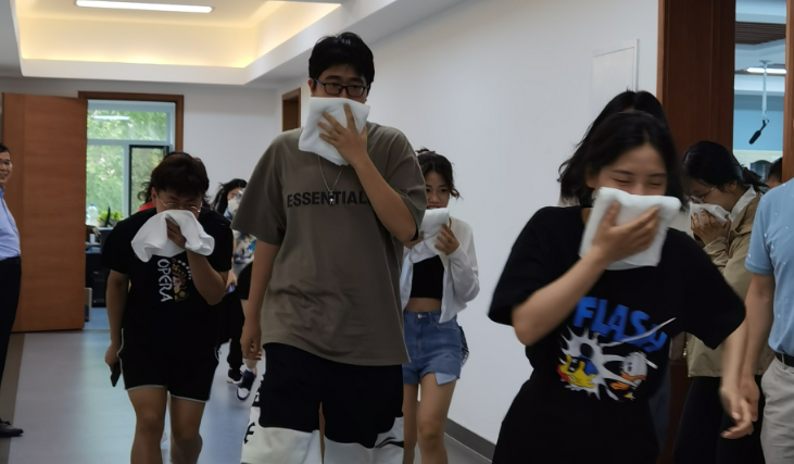 演练前,卢贵华老师简明扼要的讲解了引发火灾的常见诱因、几种常见火情的处置、基本逃生和救援技巧,对常见型灭火器、火灾自救呼吸器的使用进行了细致说明。讲解后,组织同学们进行了模拟火灾逃生演练。