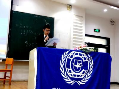 本科生陈永吉(2013级)上台致辞,他表示,模联大会是非常要求参与度精神的会议,希望与会代表可以积极参与推动大会议程。他认为,一个模联人应该有改变世界的勇气和决心,“知其不可而为之”,国际政治是一个不讲感情的冰冷的舞台,与会的各方代表会在会议中为自己代表的国家争取最大的利益而激烈争执、辩论是正常现象,但是在会场外,各位代表可以成为很好的朋友。最后,本次大会在三个委员会主席的敲锤仪式中正式宣布开始。