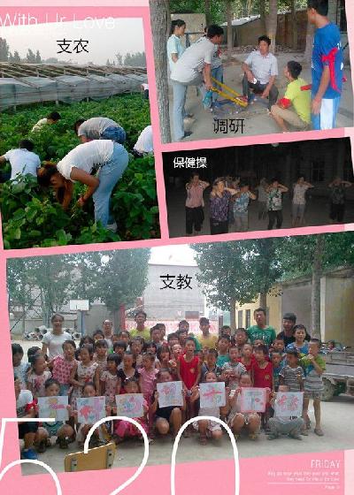 的志愿者们每天早上5点半便起床了,简单的洗漱后便开始下地干农活,露水打湿了他们的裤脚,苇草剌红了他们的胳膊,志愿者彭利端说:“我们年轻人就应该吃点苦,在艰苦的环境中努力提高自己的能力、磨练自己的意志、增强自己的本领”。做过农活、吃过早饭后,志愿者们开始了一天的支教、调研活动。晚上8点半左右,志愿者们便来到村委大队的院子里教妇女跳广场舞、教老人做保健操,村民的淳朴热情激励着志愿者们不遗余力的教动作,院子里时不时传来阵阵欢笑声,也吸引来大量村民的围观。志愿者们回到居住的地方已经晚上10点半左右了,接下来的并不是休息,而是一天服务实践活动的总结、第二天活动的安排与理论学习,并积极开展针对当天活动的批评和自我批评。