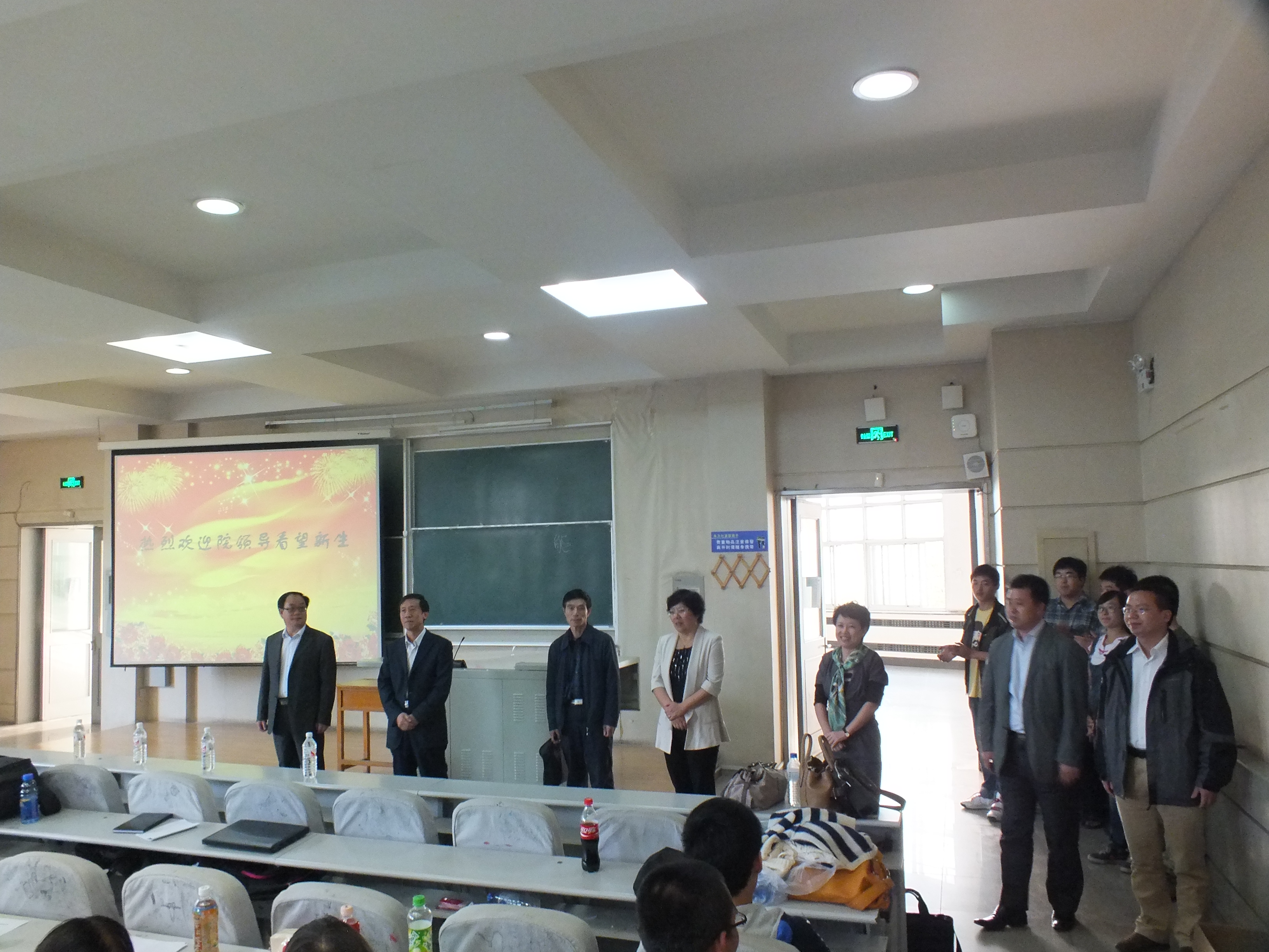 党委书记边铁,院长张贤明,党委副书记常有余,副院长刘雪莲、许玉镇、殷冬水、范斌等学院领导在本科生辅导员刘洋和助理辅导员吴兴识的陪同下来到逸夫教学楼第三阶梯教室看望刚刚参加过入学典礼的全体2013级新生。