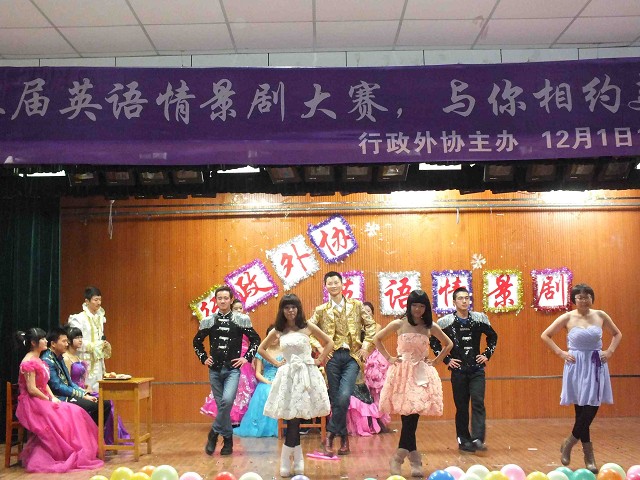 2012级的四支参赛队伍为观众带来了一场精美绝伦的视听盛宴。在精彩的开场白后,行政管理专业三班率先登场,身着T恤衫和牛仔裤的他们,向观众展示了青春的激情与活力。悠扬的歌声,迷人的舞蹈,正是他们“歌舞青春”主题的真实写照。随后,政治学专业二班同学将观众带进了古老的西方宫殿,英勇的骑士、美丽的公主、善良的王后、邪恶的女巫,《紫玫瑰》的经典童话被他们演绎得淋漓尽致,赢得场下观众的阵阵掌声。在同学们的期待中,政治学专业一班呈现的《睡美人》拉开帷幕,在继承原著经典剧情的基础上,同学们充分发挥自己的想象力,形象展现王子与睡美人爱情的同时,又突出的塑造了一个想要取宠于国王的小王妃形象,成为全剧的一大亮点,赢得了现场观众的一致好评。最后,行政管理专业四班的情景剧《真爱至上》闪亮登场,浪漫温馨的婚礼场面,动感十足的机械舞,悦耳动听的英文歌曲,让现场观众久久陶醉于其中。期间,在同学们的热情邀请下,评委嘉宾们也纷纷献上歌曲将比赛推向高潮。