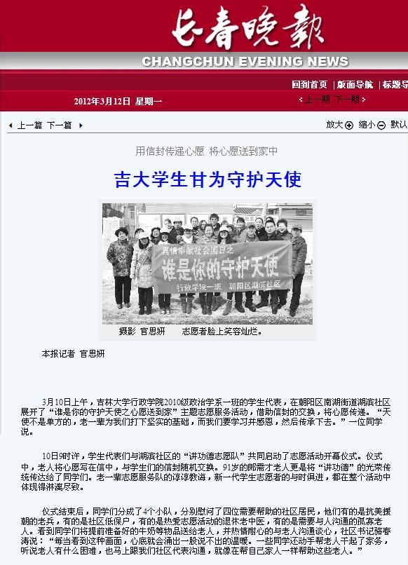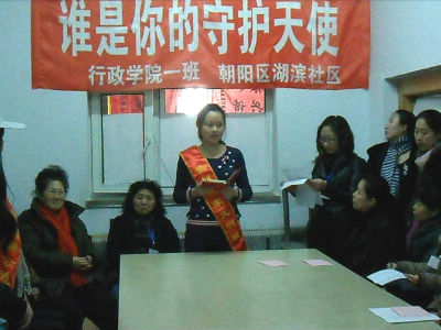 团委副书记马远俊及2010级政治学一班学生代表于3月10日上午来到朝阳区湖滨社区,展开了以“谁是你的守护天使”为主题的团日志愿服务活动,此次活动受到了《长春晚报》的关注和报道。