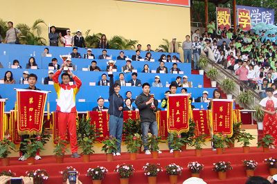 07级的韩梦茵同学在女子标枪比赛中以44.5米的好成绩打破了尘封16年的纪录,成为新纪录的保持者;08级的李鹏龙同学一人勇夺三枚金牌,几乎占全校金牌总数的九分之一。同时,我们精心准备的长拳和舞蹈表演也得到校领导和专家评委的一致好评。