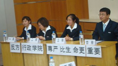 对阵传统强队哲学社会学院辩论队,就尊严和生命的重要性问题展开讨论。我方作为反方,观点是“尊严比生命更重要”。首场比赛中我们获得了胜利,顺利晋级。