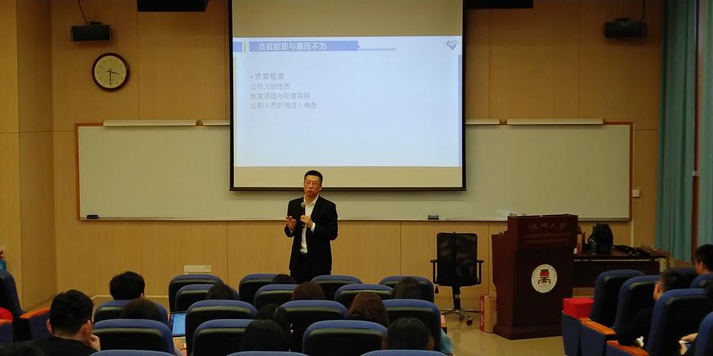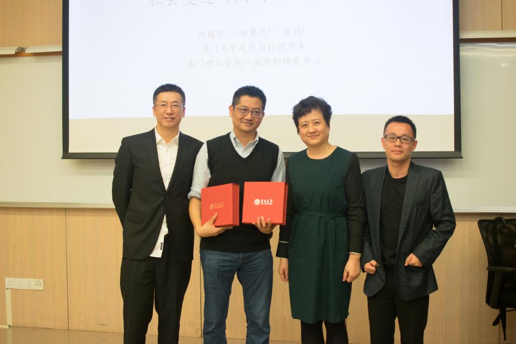 刘雪华教授,题为“廉能文化建设:我国廉政建设的新视野”的学术讲座和澳门大学社会科学学院政府与行政学系助理教授陈建新博士,题为“社会变迁对澳门治理的影响”的学术讲座。刘雪华教授介绍了高压反腐下存在的“廉而不为”现象,并从公权力性质,制度诱因和陷阱、公职人员的理性人角色等三个方面分析了其深层原因,探讨了廉能文化建设的必要性及基本路径。陈建新博士以行政改革相关的概念变迁为主要内容,探讨了绩效评估机制、政府规模、政府大数据应用等三个主题。讲座过程中,陈建新博士为在场师生介绍了青岛模式、福建模式、杭州模式、甘肃模式和广东试验等地方政府绩效评估模式,重点对广东试验模式的特点进行了总结。他还介绍了澳门特区政府绩效治理的发展情况,并指出了满意度评价存在的问题。他强调,政府规模小可带动经济增长;体现新公共管理理念的行政改革可提升行政效率;建立“企业型政府”来提升公共服务质量及效率;数据越大、融合性越高,数据的社会效益便越高。在交流环节中,调研团师生分别就政府购买公共服务的种类和范围、累积性满意度调查问卷使用者忠诚指标解读、智慧城市建设与大数据潜在风险等方面内容与陈建新博士进行了深入探讨。