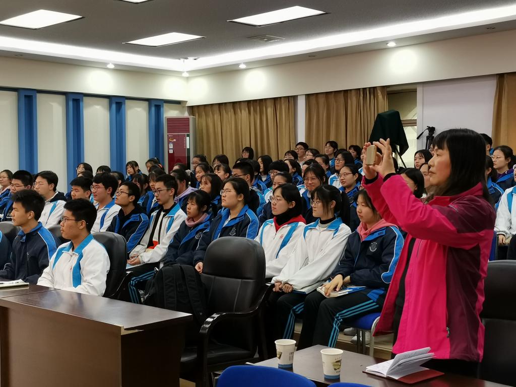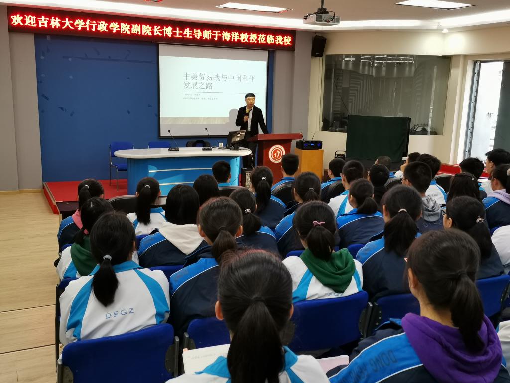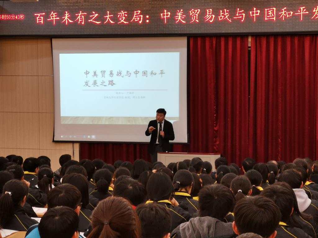 一行来到湖北省重点中学东风高级中学。首先,于海洋教授在报告厅为100余名高三文科生做了题为“百年未有之大变局:中美贸易战与中国和平发展之路”的专场学术报告。随后,进行了“麻豆