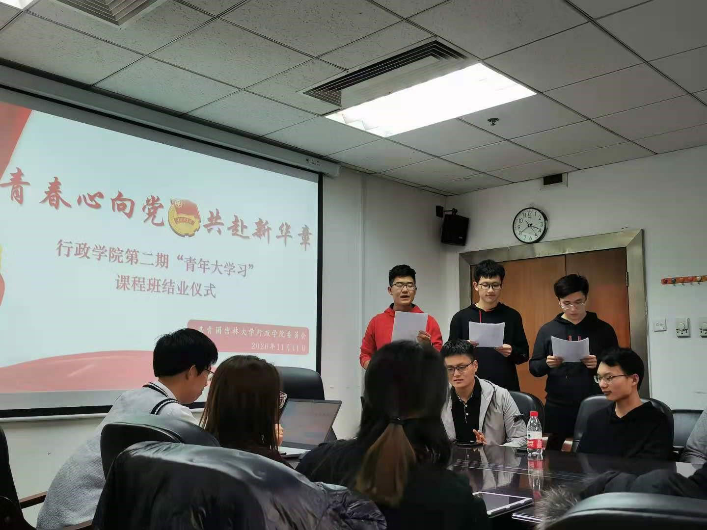 活动开始,全体起立共唱中国共青团团歌。随后,青年学习班成员以小组为单位进行学习活动的回顾与学习感悟的分享。五个小组汇报形式多样,通过朗诵、填词、歌曲等方式展示自开设班级起至今的点滴收获。由王世亨为结业学员颁发证书并合影留念。樊昊祺作为优秀学生代表发言,分享自己在青年学习班的成长历程,并提出发展建议以及对未来青年学习班活动的展望。最后,王世亨总结发言,回顾青年学习班建设初衷并表达了对青年学习班同学的殷切嘱托。