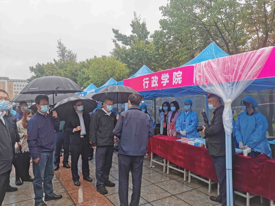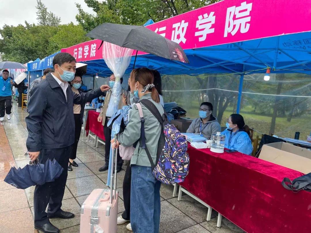 学院对新生报到接待工作始终予以高度重视。22日上午,院长张贤明、院党委书记马景惠、院党委副书记史慕华等一行冒着细雨,先后来到五月花广场和北苑四公寓前广场,仔细检查本科生和研究生迎新组织工作,慰问现场迎新工作人员,耐心询问报到工作进展,详细了解了受疫情影响延期报到的新生情况。张贤明对学生志愿者热情周到的工作态度表示赞许,并叮嘱大家严格落实学校有关迎新工作的统一部署,始终以确保师生健康安全为重中之重,密切关注有关疫情防控和新生报到的工作动态,做好有关情况的解释说明,以饱满的热情和昂扬的斗志帮助新生顺利且愉快地开启“天下为公”的新征程。