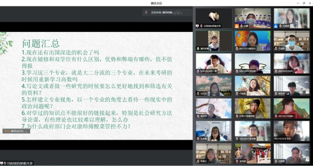 在2021级一班的班会上,班主任林奇富老师、田玉麒老师首先了解了同学们在居寝学习和生活中遇到的问题,并做出针对性的建议和指导。紧接着陈俊秀、冯一坤为大家介绍了当前疫情防控的严峻形势以及学校的防疫要求。刘享依和李佳璇则结合自身的志愿服务经历讲述了行政学子的抗疫故事,从她们的讲述中同学们感受到了全体一线工作人员和志愿者的辛勤付出。最后,班会在赵莞昕、万子君带来的心理健康知识分享中轻松愉快地结束。