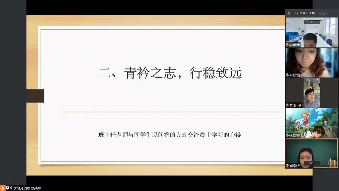 在2021级三班的班会上,班主任王岩老师首先表达了对全体同学学习及生活情况的关心与慰问,并向同学们推荐阅读《我在天堂那五年》,鼓励同学们在疫情中探寻生命的意义。班主任郭锐老师叮嘱同学们在疫情中要做到停课不停学,并表达了自己“疫情终将结束,春天必将到来”的美好希望。接下来志愿者同学分享了疫情中的志愿故事,在感慨志愿工作艰辛的同时,也感受到了为同学服务的快乐和被同学认可的满足,一些同学听后表示自己也要加入志愿队伍当中。会议最后,胡梓烁、田亮羲将收集到的班级同学近日遇到的问题向老师进行了反馈。