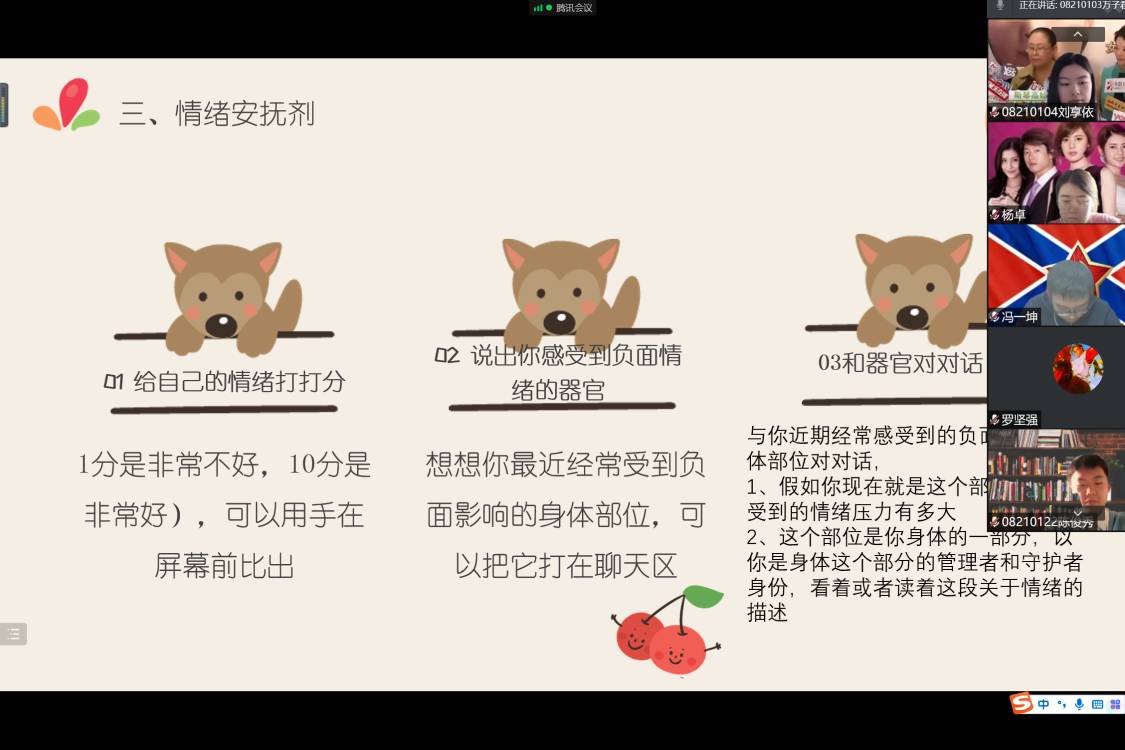 为引导同学们关注自身心理健康,利用团体动力和人际支持,探索心理支持资源,排解在线学习中的困扰,促进班级成员互助,3月18日至3月25日,在大学生心理健康中心的指导及学院朋辈心理辅导员的配合下,2021级各班召开了“心灵沟通”主题班会。
