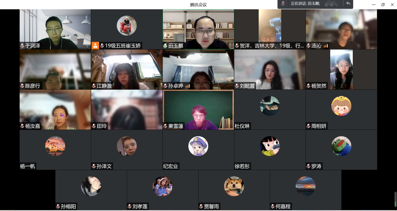24日晚,在2019级五班班会上,班级全体同学和班主任田玉麒老师针对当前疫情严峻形势共同分享封闭期间生活的感受。在班会中,田老师首先向同学们介绍了学校学院最新的防疫政策和相关措施,距离上次班会已经过去一周时间,同学们的心态也发生了一定的变化,田老师关心了同学们寝室生活的基本情况,为同学们进行了心理疏导,并向同学们介绍了学院举办的学术征文比赛并鼓励同学们积极参加。随后,田老师与贺洋、刘懿萱、罗涛等十名同学互动,询问同学们现阶段的学习状况与学业规划,为一些存在困惑的同学提供建议,传授查找文献的经验。最后,田老师勉励同学们保持定力,维持良好的身体、心理和学习状态。