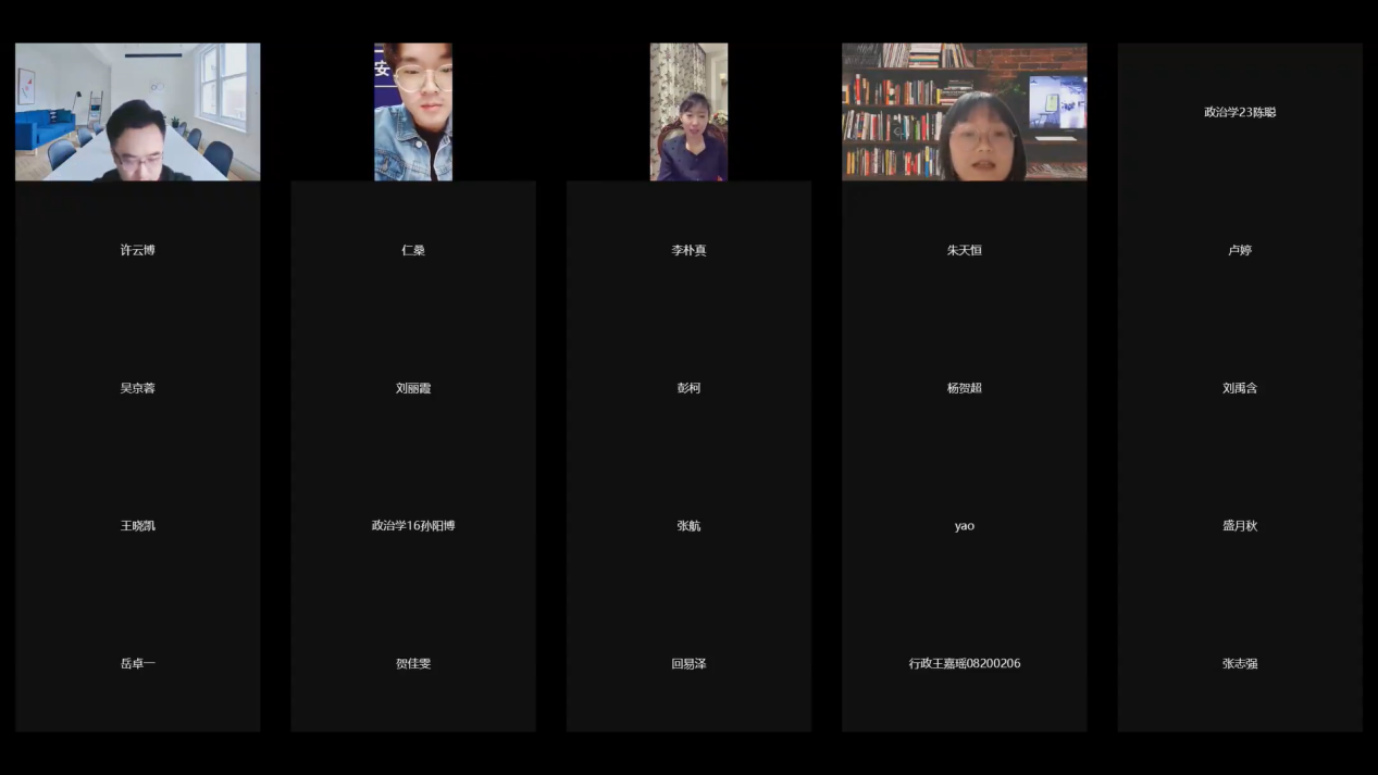 3月31日晚,2020级四班的各位同学与孙德超、董伟玮老师相聚线上,举办第三期主题班会。孙德超老师应学生需求,分享了查询期刊论文的网站,详细介绍了论文的写作方法,鼓励我们了解学术研究现状,积极创新,关注对自己感兴趣的领域有长期研究的学者,表达了对学生钻研学术、踏实学习的期望与关怀,并举出自己在做实际研究中的学术经历,为同学们提供研究经验借鉴。董伟玮老师接着对同学们表达了关切与询问,热心回答同学提出的问题,安抚大家在封寝期间的情绪,并且和大家分享交流了最近疫情期间的生活,叮嘱同学面对疫情务必要保护好自己,平衡好疫情期间学习、锻炼与作息时间。同时老师还介绍了可以进行阅读的书目,鼓励大家沉下心来阅读,丰富情感与知识。