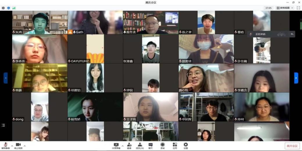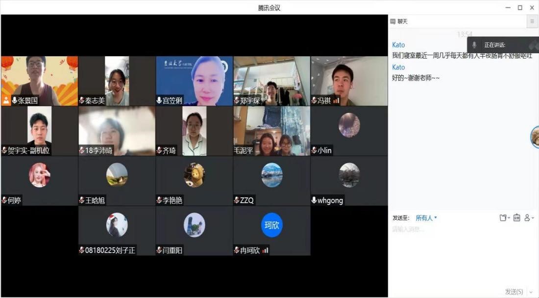 2018级二班的各位同学与龚蔚红、宫笠俐两位班主任老师再聚线上,举行第五期抗疫主题班会。龚蔚红老师首先了解了同学们近期的学习生活状态,帮助大家进行情绪疏导与日常学习规划,提醒大家要遵守疫情防控规定,积极锻炼身体。宫笠俐老师耐心解答了班级同学有关于毕业论文问题,提到同学们要重视毕业论文,多与论文指导老师沟通,规范具体写作格式,同时也要珍惜这次写论文的机会,给自己的本科阶段画上一个圆满的句号。两位老师也为即将读研的同学提出了“提前和导师联系、不要荒废时间”等学业建议。关于班级同学提出的就医、饮食等生活问题,两位老师也及时解答,积极帮同学们向学校反馈正当需求。