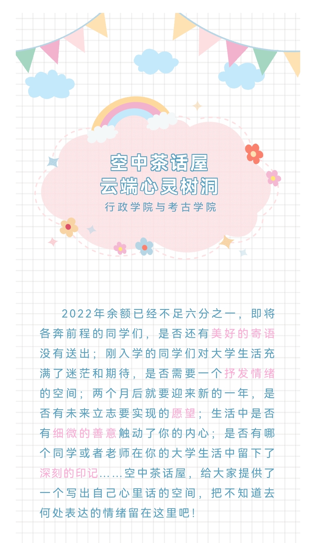 与考古学院联合开展了“空中茶话屋——云端心灵树洞”活动。此次活动以共享文档为载体,通过在文档中记录生活故事、分享生活体会的方式,拉近了同学们之间的距离,营造了良好的校园交友氛围,同时为同学们留下了一份珍贵而美好的大学回忆。