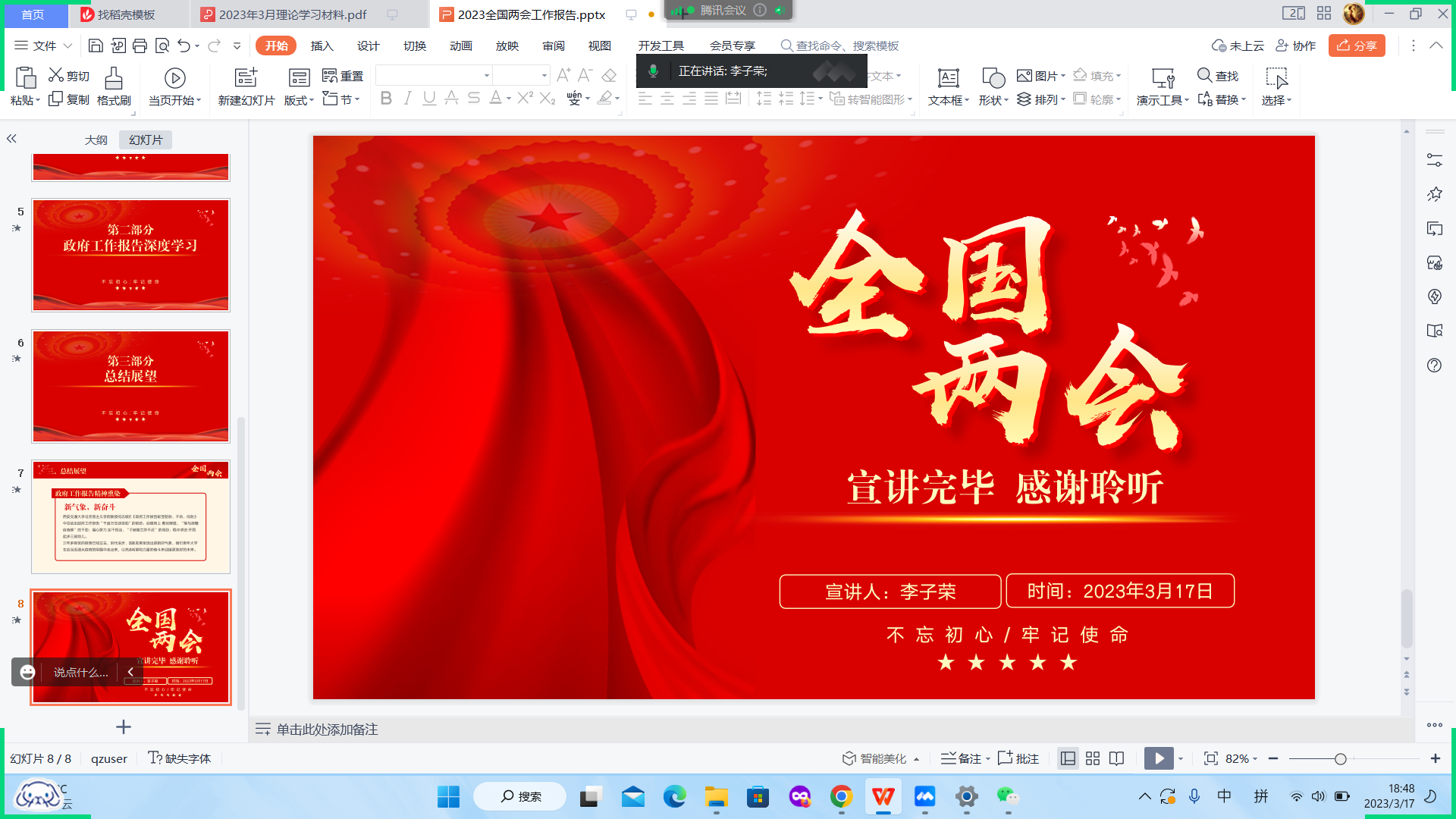 总之,同学们在本次团课过程中认真学习和领会到了两会精神,感受到了强国建设民族复兴的磅礴力量。也更加明晰了大家怀抱梦想又脚踏实地的实践方向,更加坚定了敢想敢为又善作善成的提升方向。开局知奋进,路虽远,行则将至;事虽难,做则必成。在2023年全国两会精神的倡导和党的伟大领导下,我们必会坚持以中国式现代化全面推进中华民族伟大复兴,朝着全面建成社会主义现代化强国的宏伟目标奋勇前进!(图文:2020级团支书及宣传委员 责编:麻豆