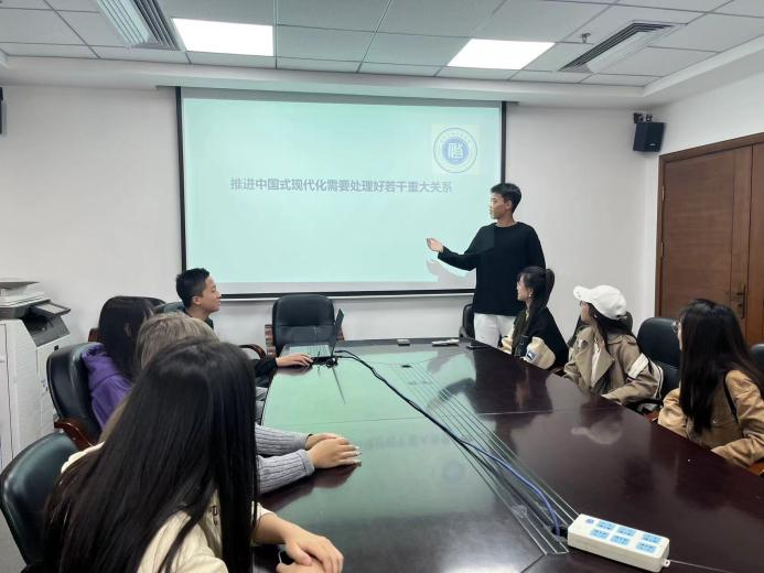 在内容解读环节,王梓(2022级本科生)为大家介绍了中国式现代化面临且亟需处理的六大关系——顶层设计与实践探索、战略与策略、守正与创新、效率与公平、活力与秩序、自立自强与对外开放,指出了中国式现代化的中国特色、本质要求和重大原则。《推进中国式现代化需要处理好若干重大关系》充分体现了马克思主义唯物辩证的思想方法,为同学们正确理解中国式现代化,深刻认识实现全面建设社会主义现代化国家的艰巨性和复杂性指引了方向。