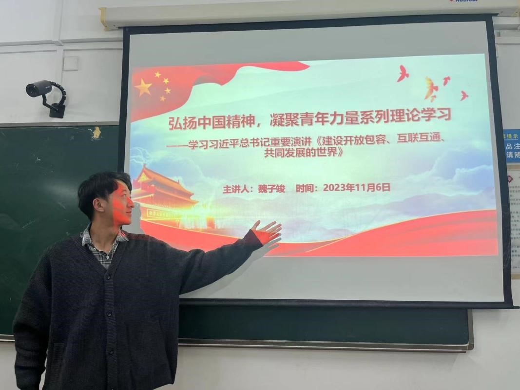 2022级本科生于2023年11开展弘扬中国精神,凝聚青年力量系列理论学习——学习习近平总书记重要演讲《建设开放包容、互联互通、共同发展的世界》主题团日活动。