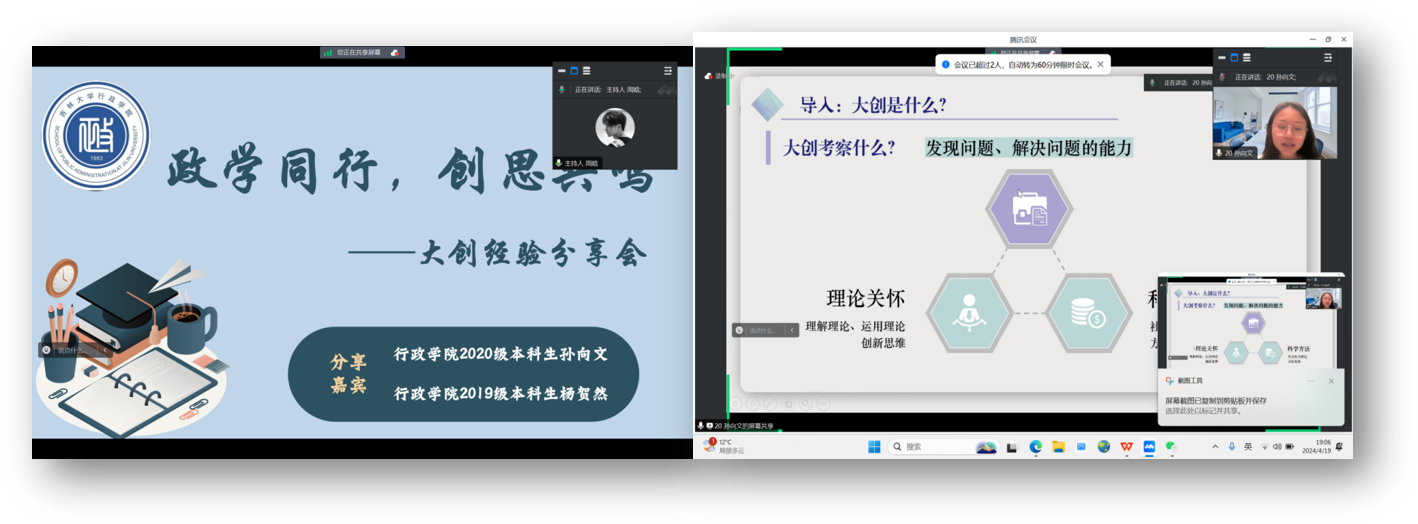 组织召开“政学同行、创思共鸣”大创经验分享会,学院2020级本科生孙向文和2019级本科生杨贺然分别以“从组队到立项——大创经验分享”和“大创之路初探——大创相关问题的解读与分析”为题,解答了大家在大创立项、团队组建、导师选择、立项书撰写等方面的疑惑。同学们纷纷表示收获颇丰,今后将以更加积极主动的心态参与到各类创新创业实践活动中,努力在创新创业项目中取得好成绩。
