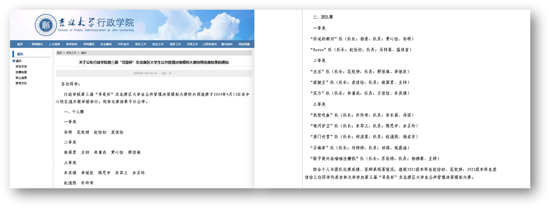 参加第三届“寻是杯”东北赛区大学生公共管理方案设计与决策模拟大赛。目前,该赛事正在进行第一阶段——方案设计比赛,5月11日和12日将进行沙盘对抗和小组答辩,期待“青松队”冲出重围,顺利进军全国大赛。