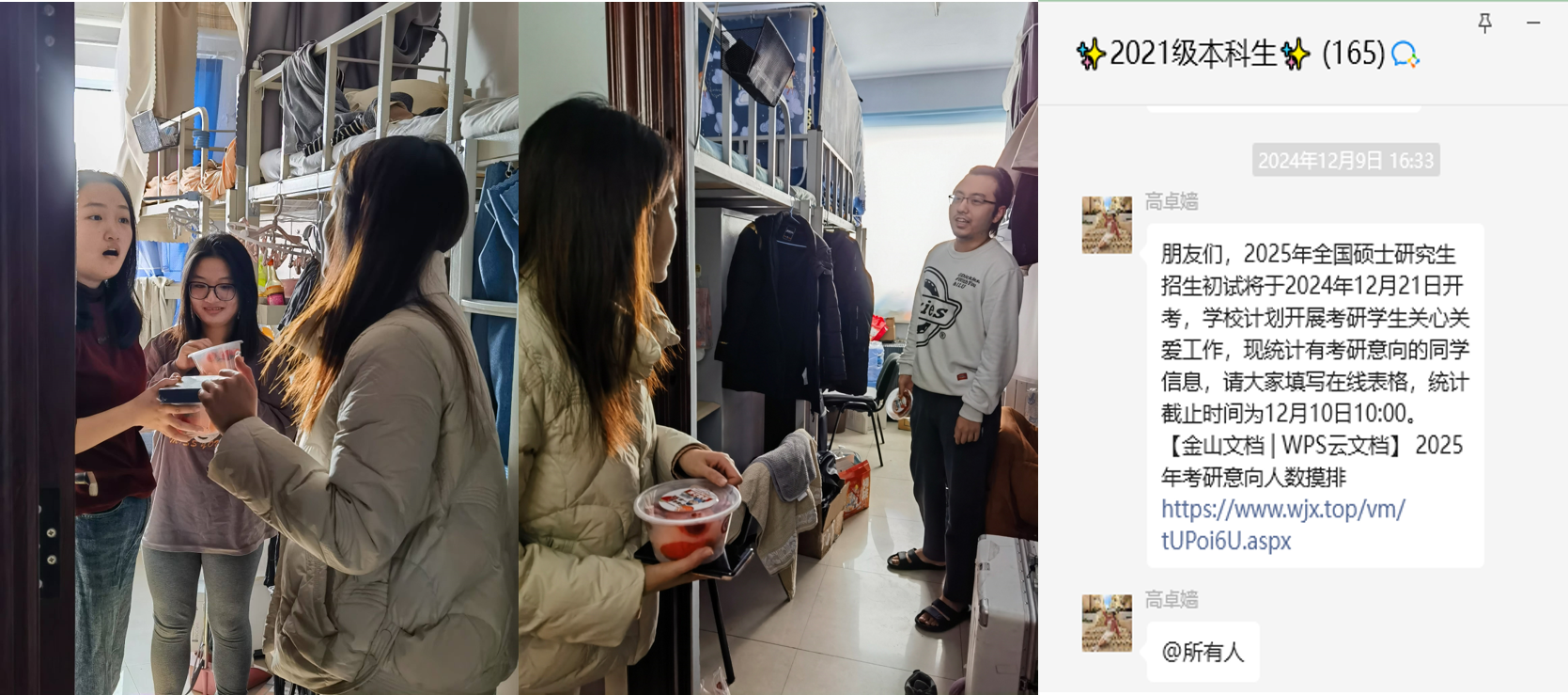 学院结合本科教育教学审核评估期间掌握到的历届毕业生毕业去向和动态,积极开展硕士研究生考试有关情况调查研究,逐一摸排学生就业意愿,详细了解研究生考试、报名和备考情况,帮助广大学生参加学业启航项目、明辨就业形势、落实毕业去向。毕业年级辅导员本院生源研究生结成帮扶对子,面向应届考生答疑解惑、分享经验。12月19日,辅导员深入毕业年级学生公寓,了解同学们的复习情况,给备考同学加油鼓劲儿,并送上爱心慰问品,排解考生焦虑情绪,鼓励学生从容自信应考。刚刚参加完研究生考试的应届生及往届生来到学院,纷纷与辅导员交流应考表现;学院党委副书记、辅导员团队耐心倾听同学们的心路历程,帮助大家总结经验教训,并根据预判的考试结果对未来毕业去向和职业发展做进一步规划。