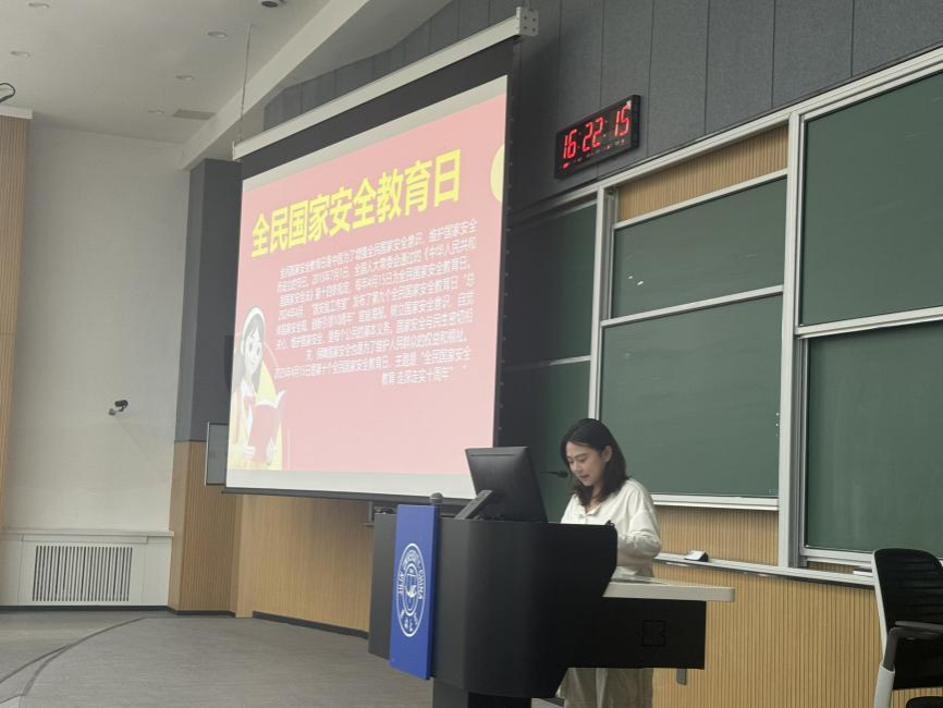 学习解读环节。活动伊始,团支书胡曼祺(2024级本科生)通过PPT视频的形式,详细讲解了总体国家安全观的提出背景及其重要意义。她结合近年来国家安全领域取得的重大成就,强调国家安全是国家发展的基石,青年应从自身做起,树立正确的国家安全观。