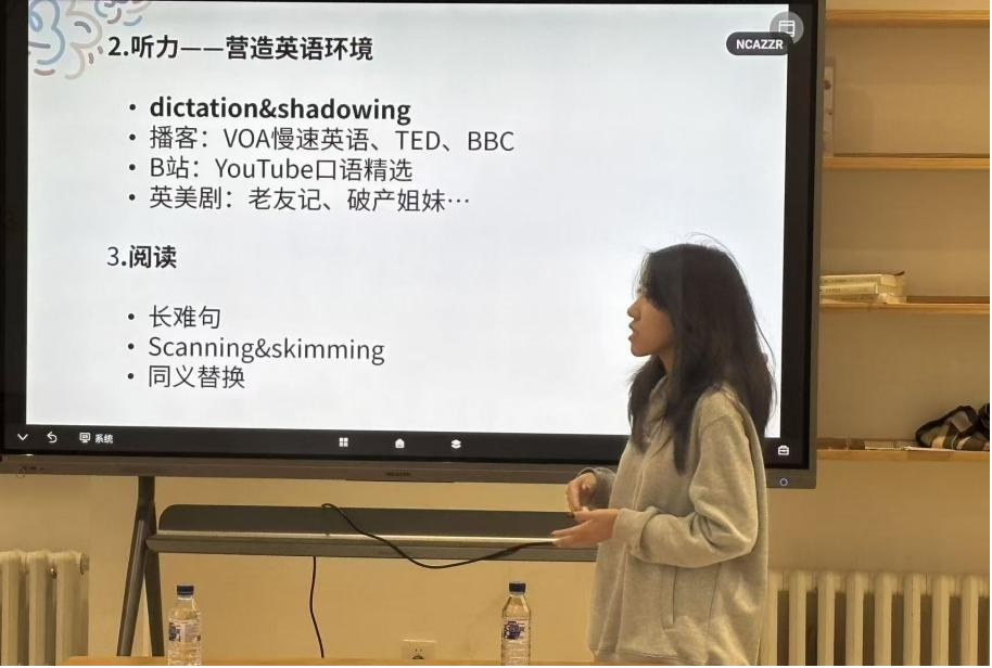 孙逸然(2024级本科生)从通用能力、竞赛备考、雅思备考三方面介绍经验。鼓励大家增加词汇量储备、多听多练习题、积累作文模板,同时结合自身竞赛和考试经验提出建议,并向大家分享了英语学习的资源。