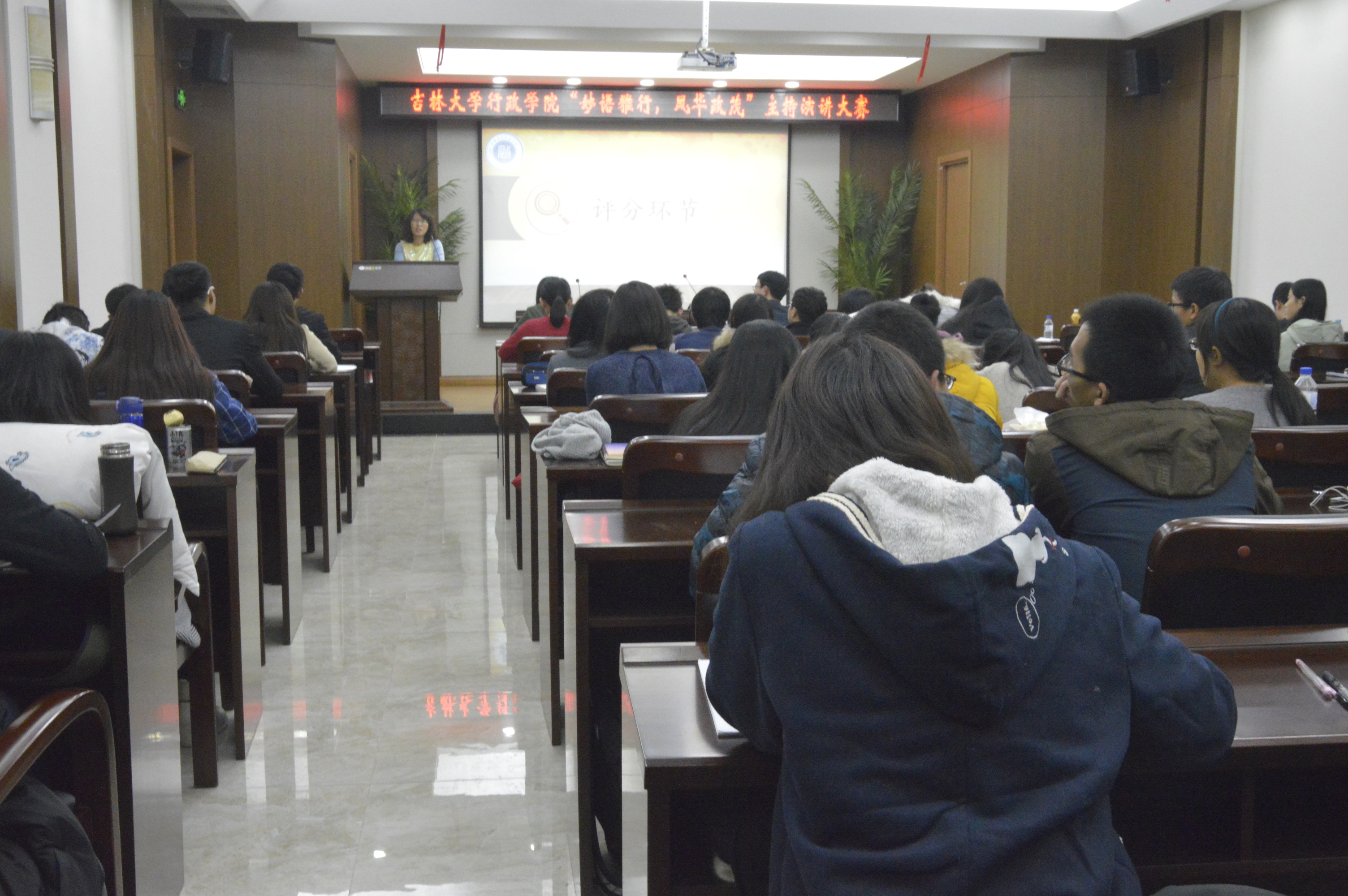 党委副书记兼副院长史慕华,本科生辅导员曲畅竹以及孙超群、李嘉琦、林明宇、雷浩、求是、白天六位学生组织干部。大赛共有十二名选手参加,分三个阶段开展。第一阶段,参赛选手随机抽取题目进行三分钟即兴演讲,演讲涉及国际政治、两岸关系和青春与梦想等主题。第二阶段,参赛选手两两分组,模拟主持新闻联播、春节联欢晚会、感动中国颁奖等活动。选手们围绕主题进行各具特色的演讲,相互配合,语言优美,表达流畅,表现不俗。第三阶段为现场评分阶段,观众在评分表上选出三位表现最好的选手和一组联合演讲选手。在评分环节,大家通过视频回顾了决赛选手的初赛历程。史慕华就本次大赛进行了总结和点评,她表扬了参赛选手具有趣味性、思想性、严谨性的优点并指出了选手们在穿着、仪态上的不足之处。本次活动选出了六名优秀奖、三名三等奖、两名二等奖和一名一等奖,16级本科生宋志浩夺得桂冠。