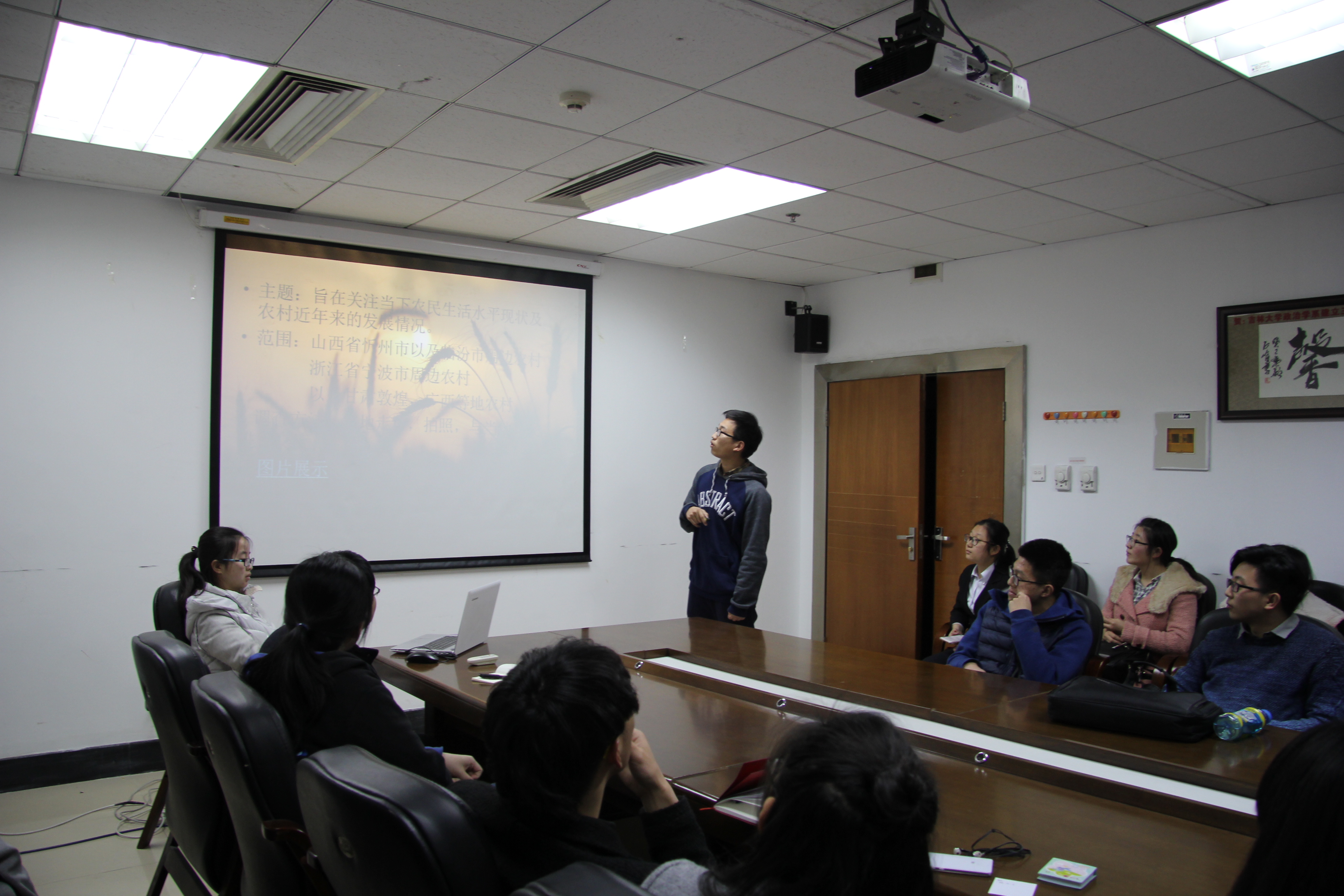 会议于下午六点正式开始。首先,曲畅竹进行讲话,对寒假期间同学们积极参与实践调研的精神表示赞赏,强调大学生要将专业知识与社会实践相结合。接下来共有九组成员分别展示了自己的实践成果。有六个小组关注了当前中国农村问题,他们从农村基层政治组织、经济发展、教育医疗等方面对农村居民的生活现状进行了较为全面的调查与分析,并针对相应问题提出了解决方案;另有两个小组分别在政府部门进行实习,实地地感受政府办公流程,亲身体验政府工作内容,用切身的实践来感受政府的行政方式;最后一个小组对当前的雾霾情况进行了调查、分析,并分别从政府与公民各自的职责方面进行总结并提出了建议。会议最后,孙超群对会议进行总结,对各组的实践成果给予了充分肯定,同时又在PPT制作与语言表达方面对各组成员提出建议。