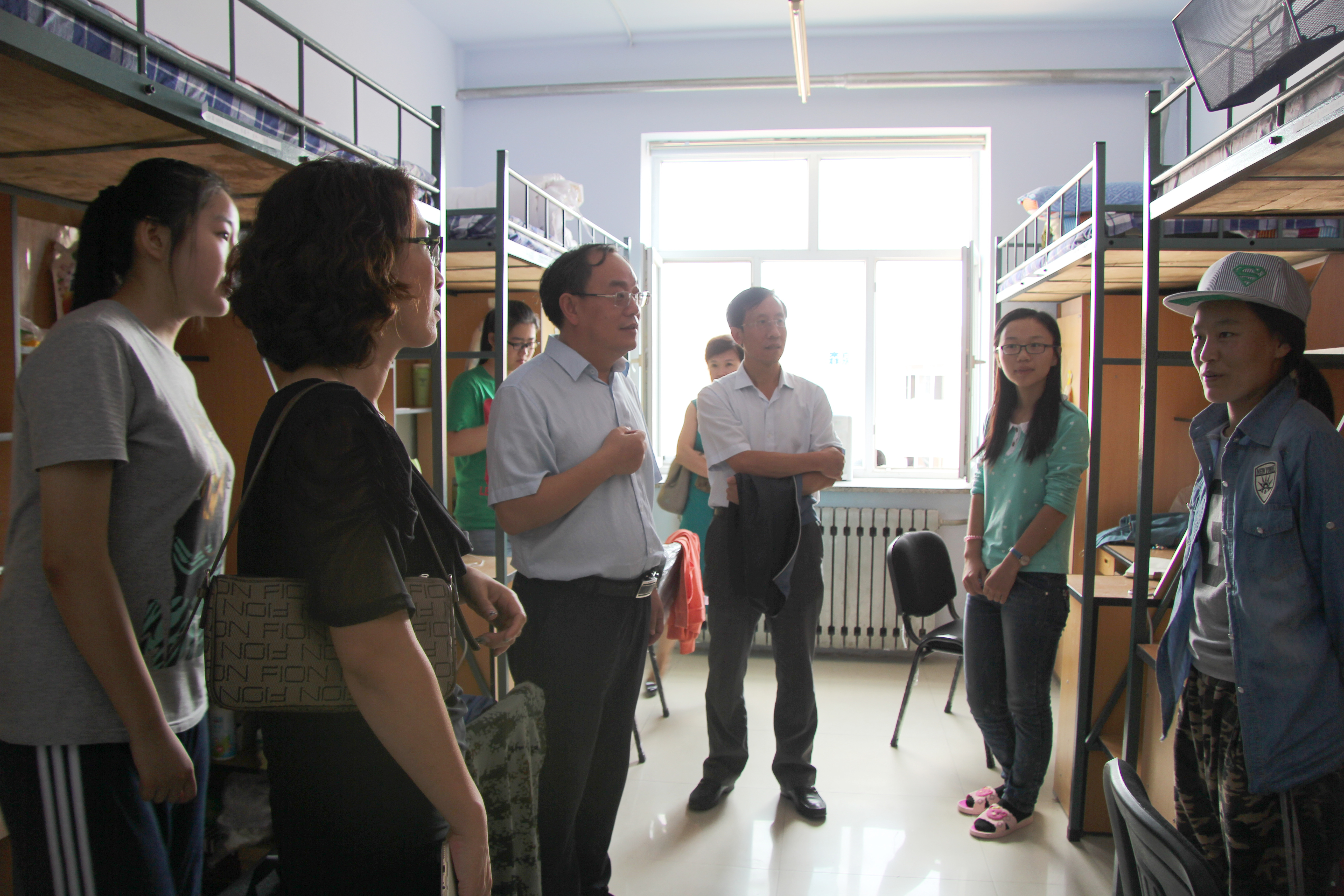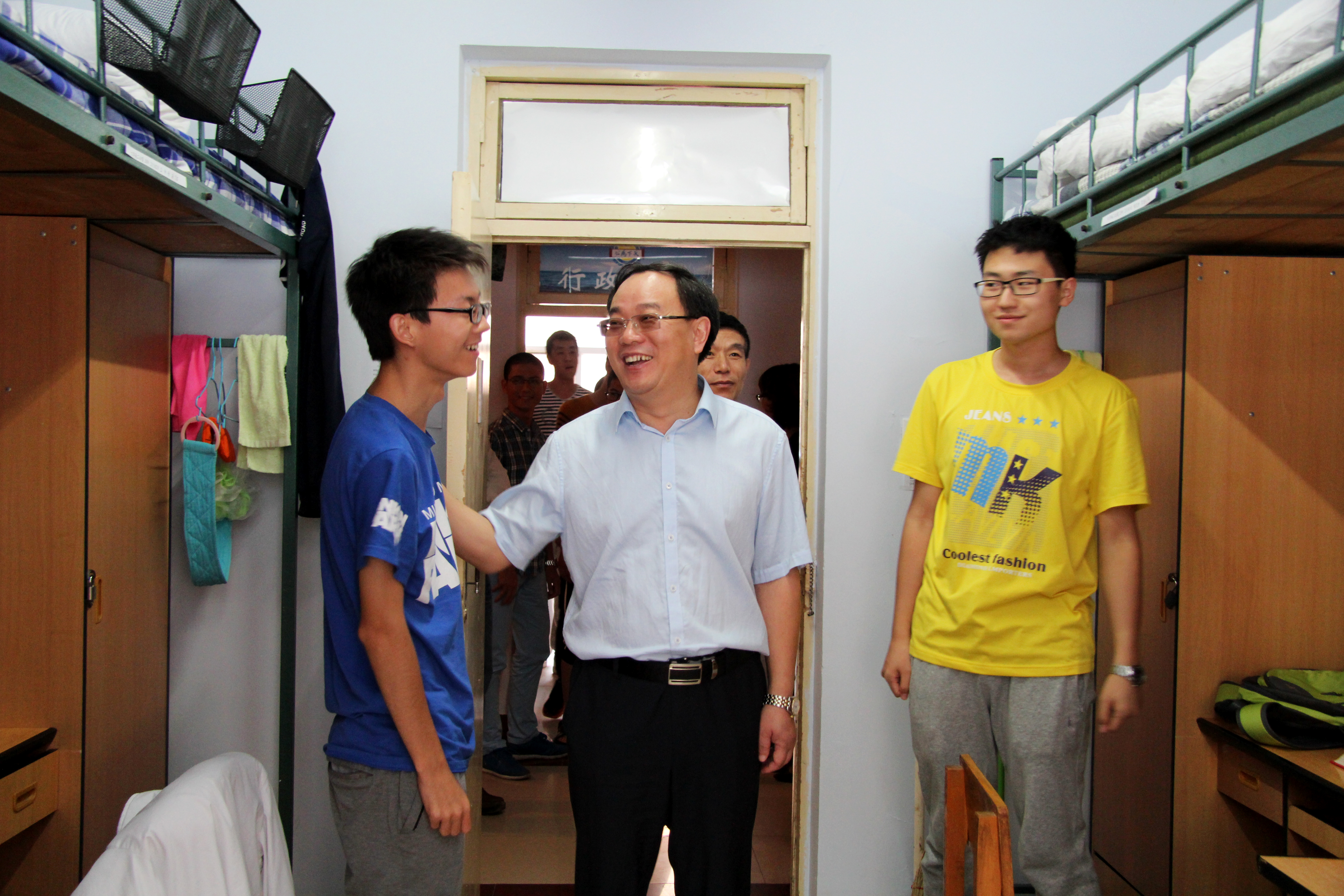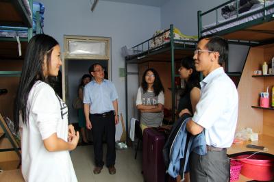 院领导一行先后看望了居住在大学城二公寓、三公寓的2015级新生。院领导对寝室进行了逐个走访,并与学生们进行了亲切交谈。见到南方来的学生,张贤明院长就关心地询问其是否习惯东北的气候与饮食;在交谈中得知有部分外省学生独自乘坐火车来到学校报道,张贤明院长对其自立自强的表现给予了赞扬。边铁书记亲切叮嘱学生们要互相帮助、彼此照顾,营造一个和谐的寝室氛围。对于大学的学习与生活,院领导不仅给出了一些很好的建议,而且也代表学院表达了对于2015级新生们的期望。