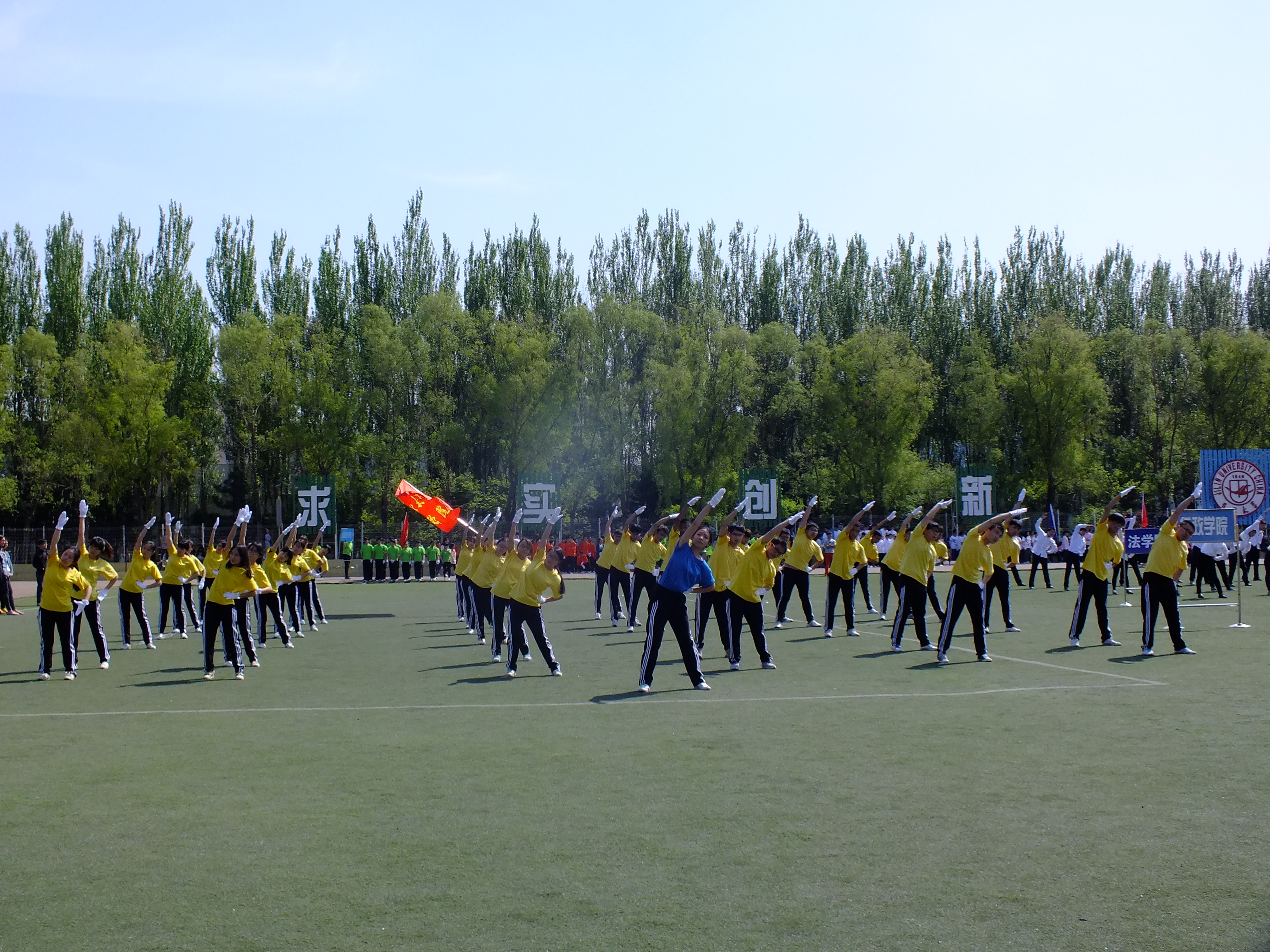 的磅礴大气,也喊出了每个行政学子的公共情怀。比赛场上,同学们面带自信的微笑,伴着轻快的音乐节奏,做出整齐划一的动作,追求最佳的统一与协调,体现了行政学子的团结友爱精神。本组比赛结束后,全体参赛学生在体育场进行合影留念,留住这一激动人心的时刻。10时许,2015年麻豆