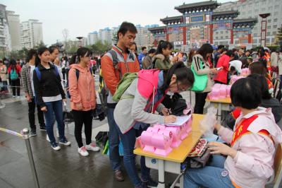 志愿者在团委志工部副部长张昊(2013级)的带领下,积极参加了此次活动。大家在志愿服务宣传板上签名,并成功领取了储蓄罐。