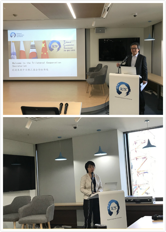 12月18日,调研团来到韩国首尔市中日韩三国合作秘书处访问、调研。期间,经济事务处处长乔文以及社会文化事务处处长Nagafuch,Kenji分别对于中日韩三国秘书处总体情况作出的介绍。在讲座中,他们从发展历程、职能与活动以及组织结构三方面向调研团师生介绍了中日韩三国合作秘书处的情况。秘书处的发展历程是由第二次中日韩领导人会议期间,三国领导人同意建立三国合作秘书处开始,经历签署《关于建立三国合作秘书处的备忘录》直至签署《关于建立三国合作秘书处的协议》,三国合作秘书处于2011年在首尔正式建立,至此已经经历了四次换届;主要职能与活动在于支持三国磋商机制、宣传三国合作、开展合作项目、与其他国际组织交流合作以及研究及编纂资料库五项,乔文处长指出,目前秘书处也比较注重文化与社会方面的问题,尤其关注青少年的相关问题,并举办了青年大使项目等品牌项目;在组织结构方面,秘书处由协商委员会和四个职能部门组成,协商委员会由一名秘书长和两名副秘书长组成,以协商一致方式就秘书处日常工作做出决策。协商委员会下设政治事务处、经济事务处、社会和文化事务处以及综合处四个职能部门。期间,调研团师生就如何申请在国际组织实习等问题提出了疑问,秘书处相关人员也做出了详细解答。