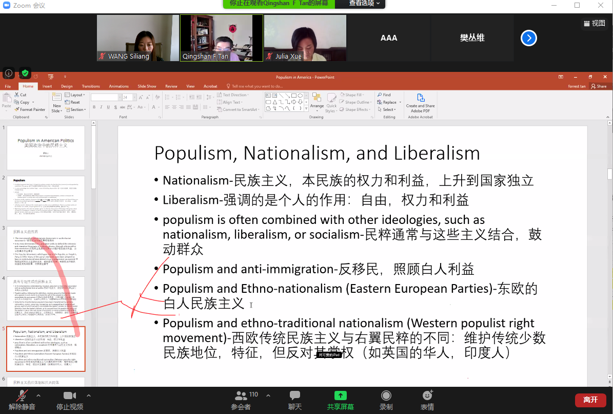 主办的国际事务工作坊第5期学术活动在Zoom在线平台举行。本次讲座邀请美国克里夫兰州立大学教授谭青山(TAN FORREST QINGSHAN)担任主讲嘉宾,作了题为“美国政治中的民粹主义(Populism in American Politics)”的在线学术讲座。学院政治学系薛洁教授担任主持人,共110余名师生参与讲座。
