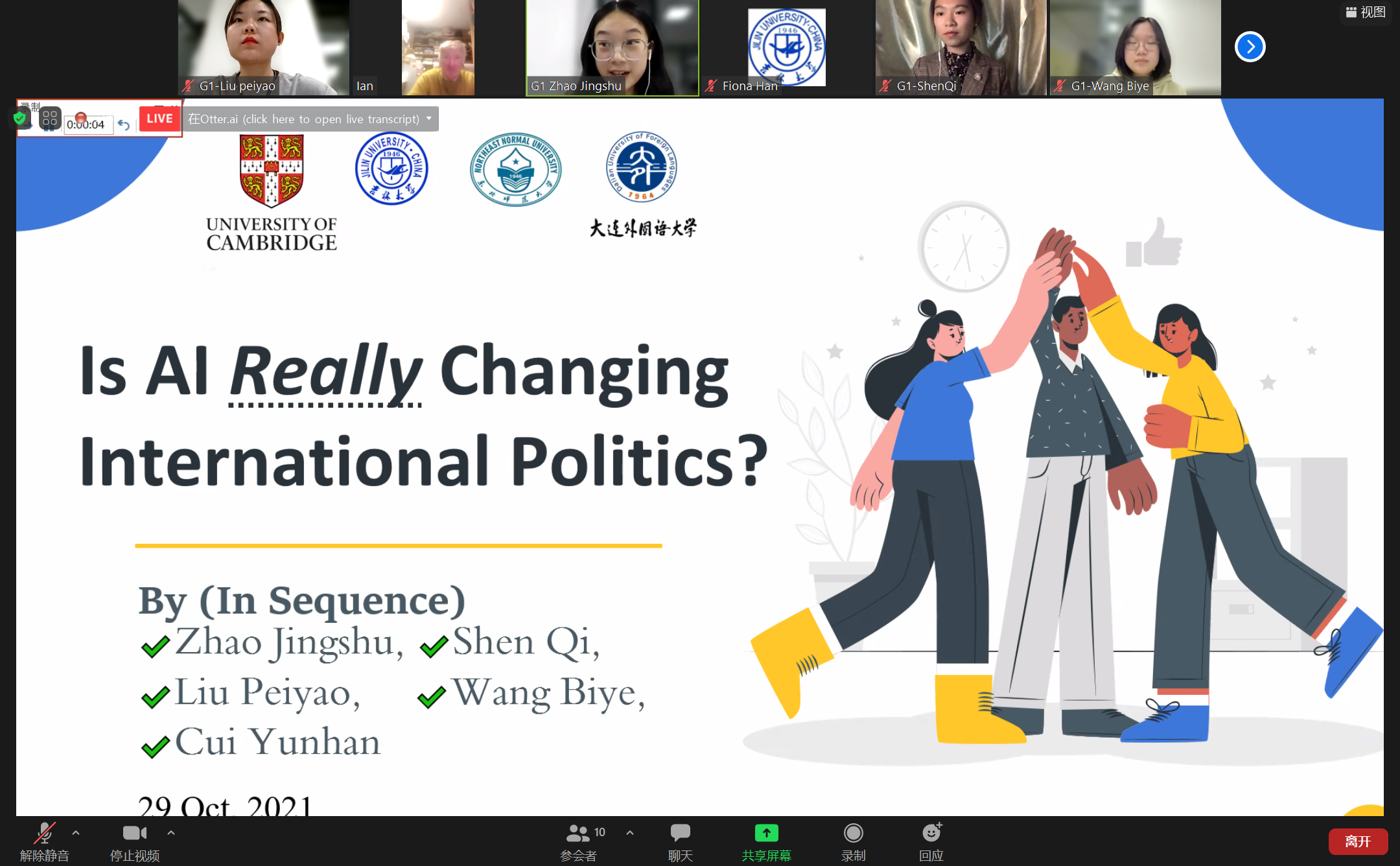 很荣幸参与了此次剑桥线上课的交流活动并获得了最佳个人表彰,我所在的小组“The terminators”也荣获了最佳小组。此次以人工智能为主题的讲授交流使我在学术方面受益匪浅,教授充分了解了人工智能通过其出众的数据分析预测能力在当前国际政治中产生举足轻重的影响,同时也向我们展示了未来AI积极或消极的可能性;而课程的另一大特色就是全英授课,在最初的一两节课虽然只是一知半解但在逐渐习惯之后便听得津津有味了,甚至可以在homework question的部分与和蔼可亲的教授进行积极地沟通互动,因而英语口语与听力也都有一定提升;学到最多的则是在与师哥师姐及外校的同学作为同一个小组的过程中,我们对课题的分工负责,统一整合中不断磨合,从最初的破冰到最后的亲密合作并一举拿下最佳小组,真的是一次很棒的体验!