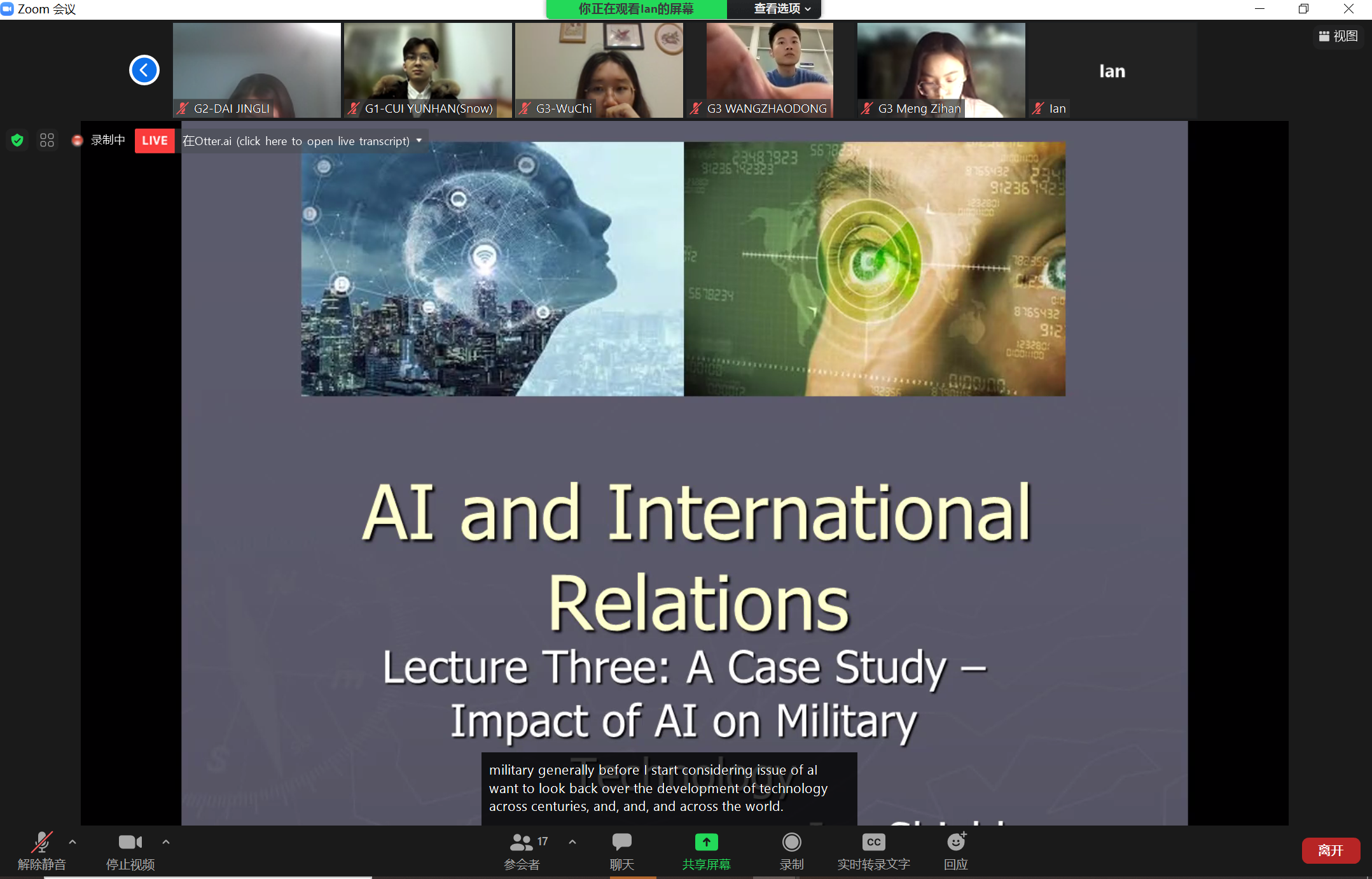 经过许宁老师在学术观点、词汇斟酌、语音语调等方面的指导后,结课展示环节中,3个小组分别就各组负责的结课主题进行展示分享。第1组分析了人工智能是否在实质上改变了国际政治,第2组讨论了人工智能在多大程度上成为衡量一个国家政治力量的新标准,第3组则说明了人工智能在气候变化领域的积极作用。展示结束后,Ian Shields教授对3个小组的各自表现给出针对性评价。
