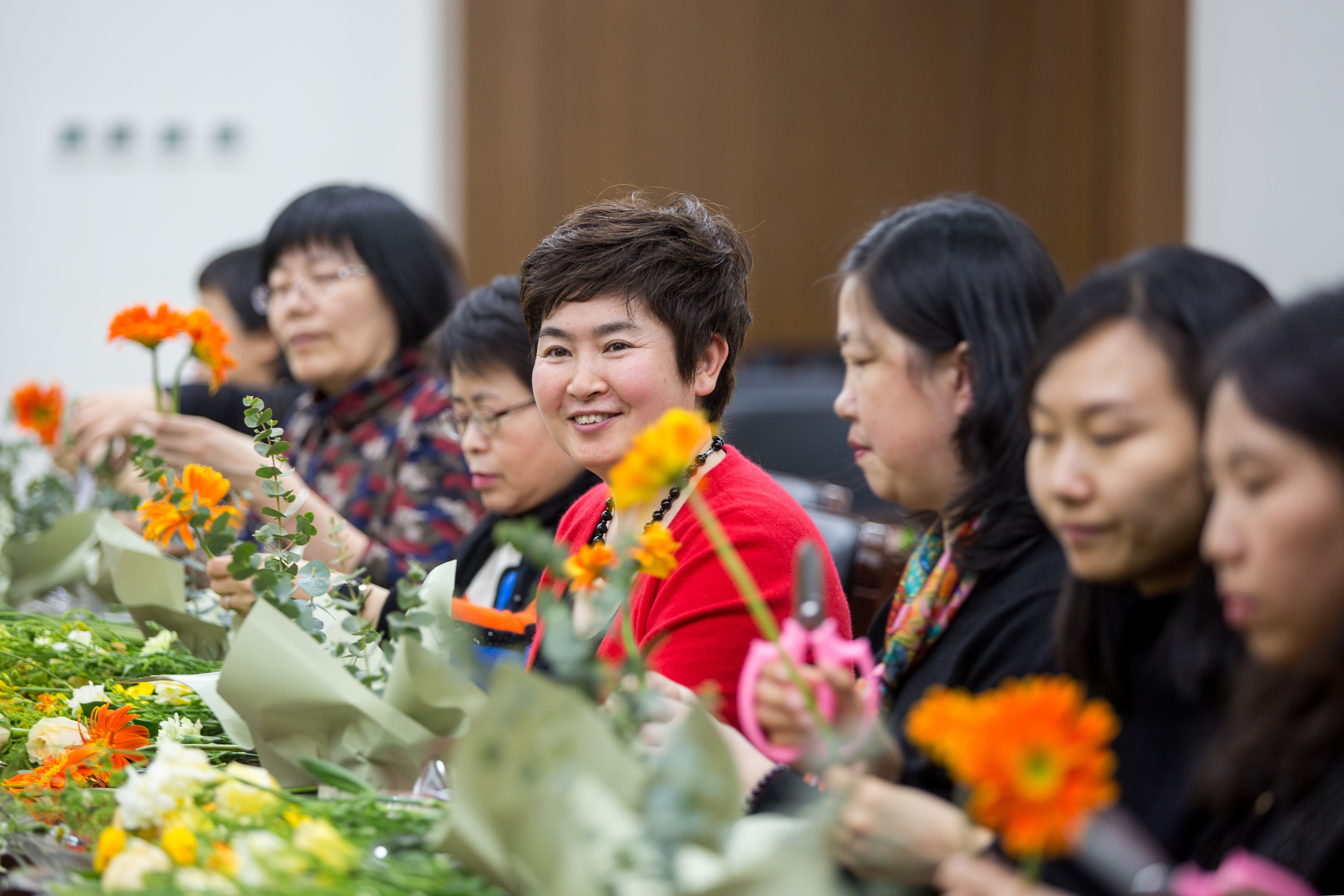 通过花艺师细致的讲解,老师们对扶郎、玫瑰、纽扣菊、康乃馨等常见花卉的花形花语和养护技巧有了深入的了解。随后,老师们纷纷拿起手旁的各式鲜花,在花艺师的示范和指导下,裁花纸、卷花泥、除花叶、插花枝,修形剪边,好不热闹。没过多久,心灵手巧的老师们便将沁人心脾、别具匠心的花卉作品一齐呈现。一捧捧争奇斗艳的花束,一张张笑语盈盈的面庞,将活动现场装点得花团锦簇、喜气洋洋,使之充满了朝气蓬勃、生机盎然的春天气息。