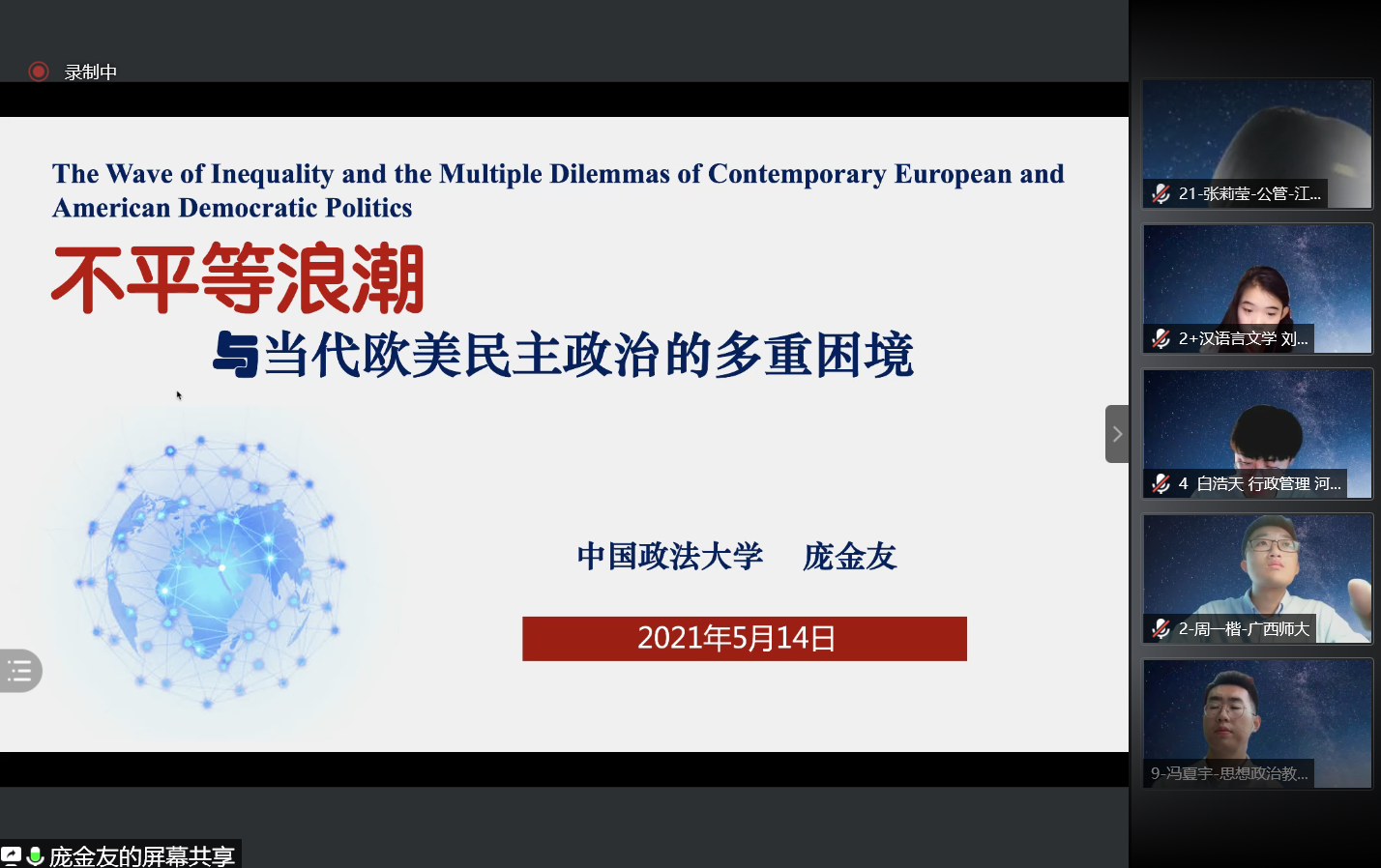 同日,学院邀请中国政法大学政治与公共管理学院庞金友教授与南开大学周恩来政府管理学院吴晓林教授为参会学生带来了精彩的学术报告会。庞教授以“不平等浪潮与当代欧美民主政治的多重困境”为主题,结合大变局时代下西方政治的新变化,深入分析了全球不平等浪潮的来源、特点、本质及影响;吴教授则以“新发展阶段的城市基层治理”为主题,通过分析当代中国特色城市基层治理案例,指明了新发展理念指导下城市基层治理的方向。线上和线下参会的同学们认真聆听,并就自己的疑惑向教授请教,两位教授进行了细致的解答,同学们收获颇丰。