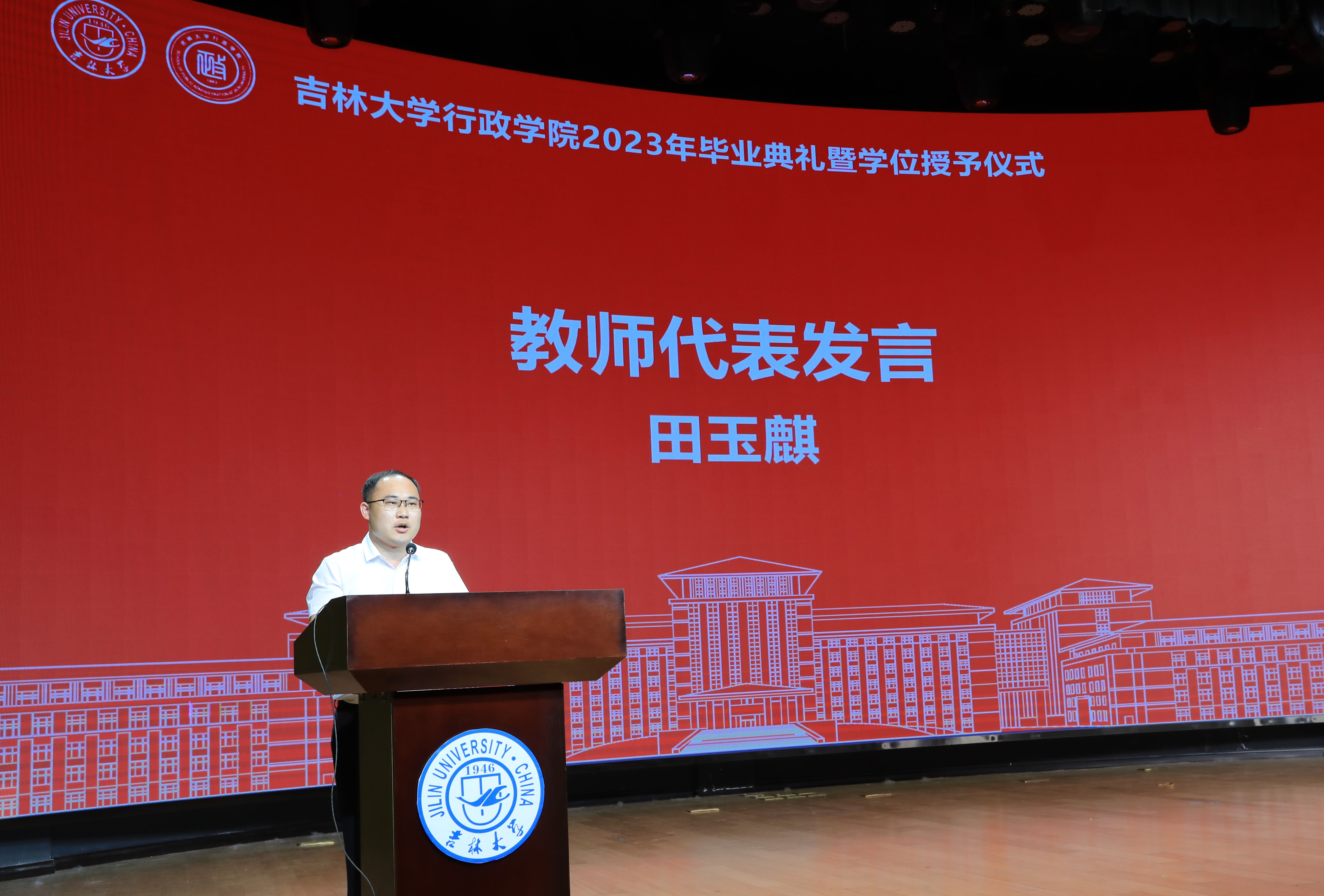 2019级5班本科生班主任、政治学系副主任田玉麒作为教师代表发言。田玉麒围绕“幸福”分享三个命题,提出幸福来自与他人的横向比较、来自与自己的纵向比较、来自追求生命意义的奋斗过程,并勉励毕业生在信息爆炸时代保持独立的理性判断,在复杂风险社会保持清醒的战略定力,在速成快餐环境保持笃定的行稳致远。